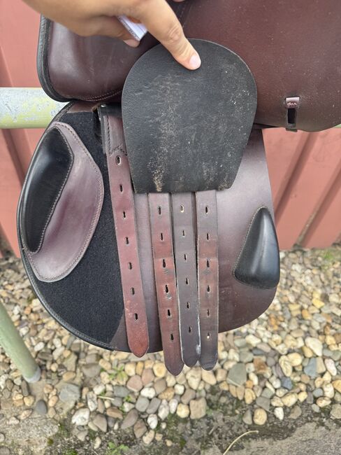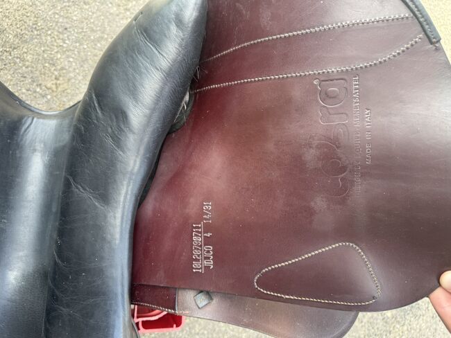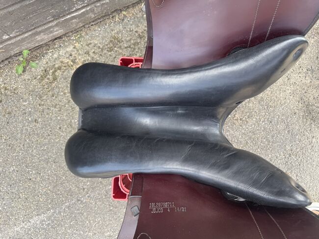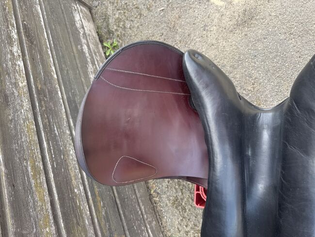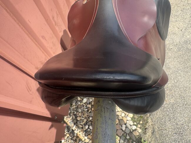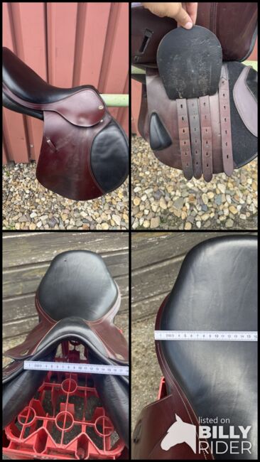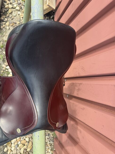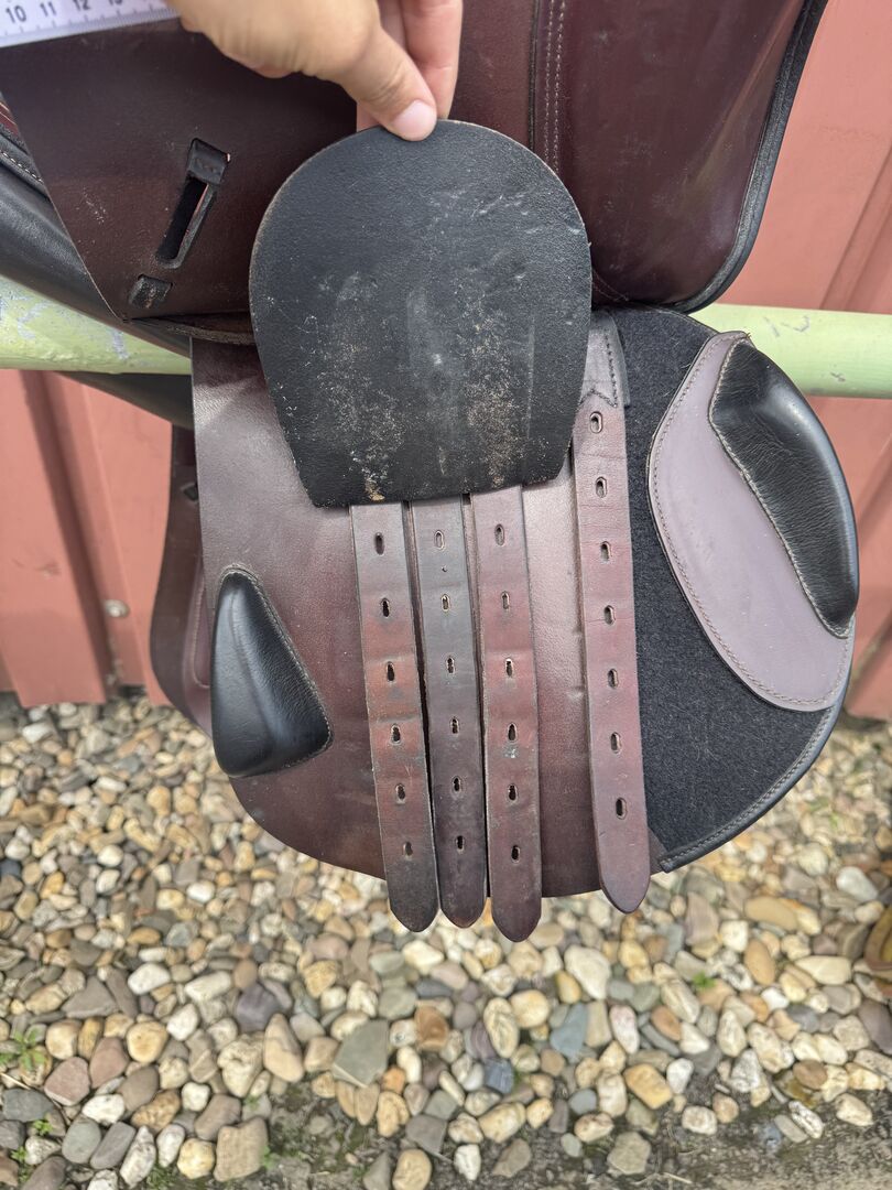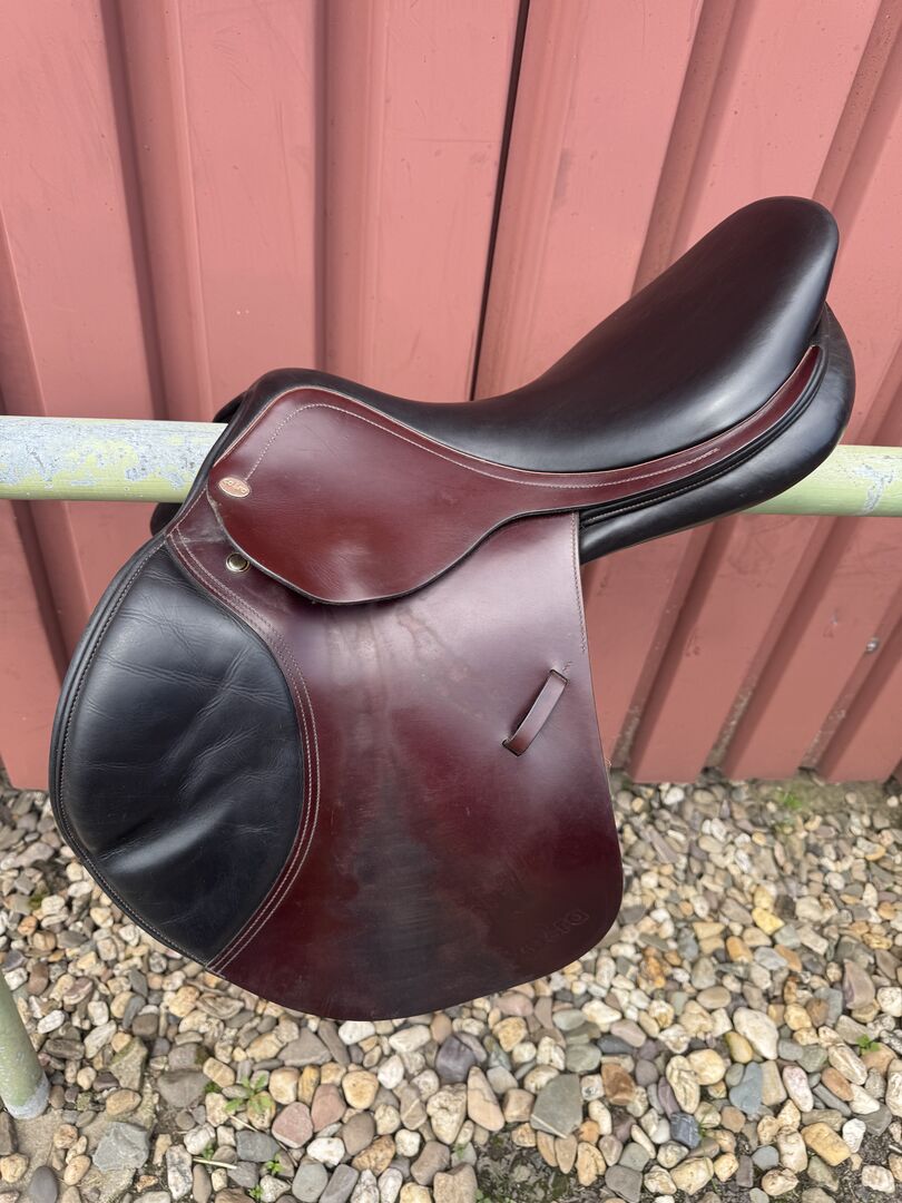 Siodło skokowe Cobra - Sprzedam siodło skokowe Cobra w kolorze czerwono-brązowo-czarnym. Siodło ma rozmiar siedziska 18 cali, szerokość komory to 4 (średnia do średnio-szerokiej). Jest również wypełnione wełną. Siodło jest dobrze używane i ma niewielką wadę w górnej części klapy siodła (patrz zdjęcie), ale nadal jest w pełni funkcjonalne. Możliwa wysyłka lub odbiór. Sprzedaż prywatna, bez gwarancji lub zwrotu.