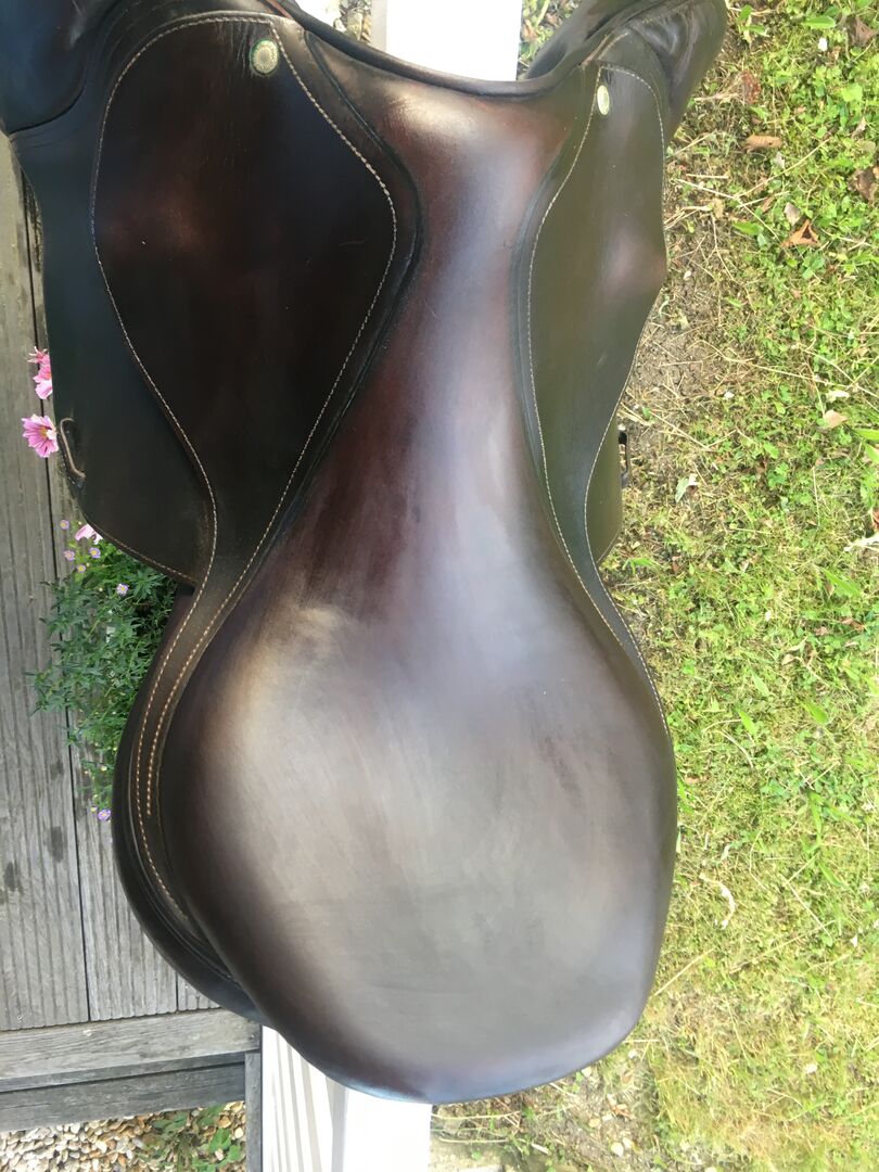 Siodło było czyszczone po każdej jeździe (ku przerażeniu mojej partnerki) i sprawdzane co 6 miesięcy przez mojego rymarza, a w razie potrzeby ponownie wyściełane bezpośrednio w Devoucoux. Zawsze była przechowywana oddzielnie od materiału siodła i z podkładkami pod strzemiona, na skórze nie widać potu ani brudu. W związku z tym jest w dobrym stanie i posiada normalne ślady użytkowania - pasy do pasa również są w dobrym stanie. W zestawie znajdują się pasujące skóry strzemion Devoucoux w dokładnie takim samym kolorze.