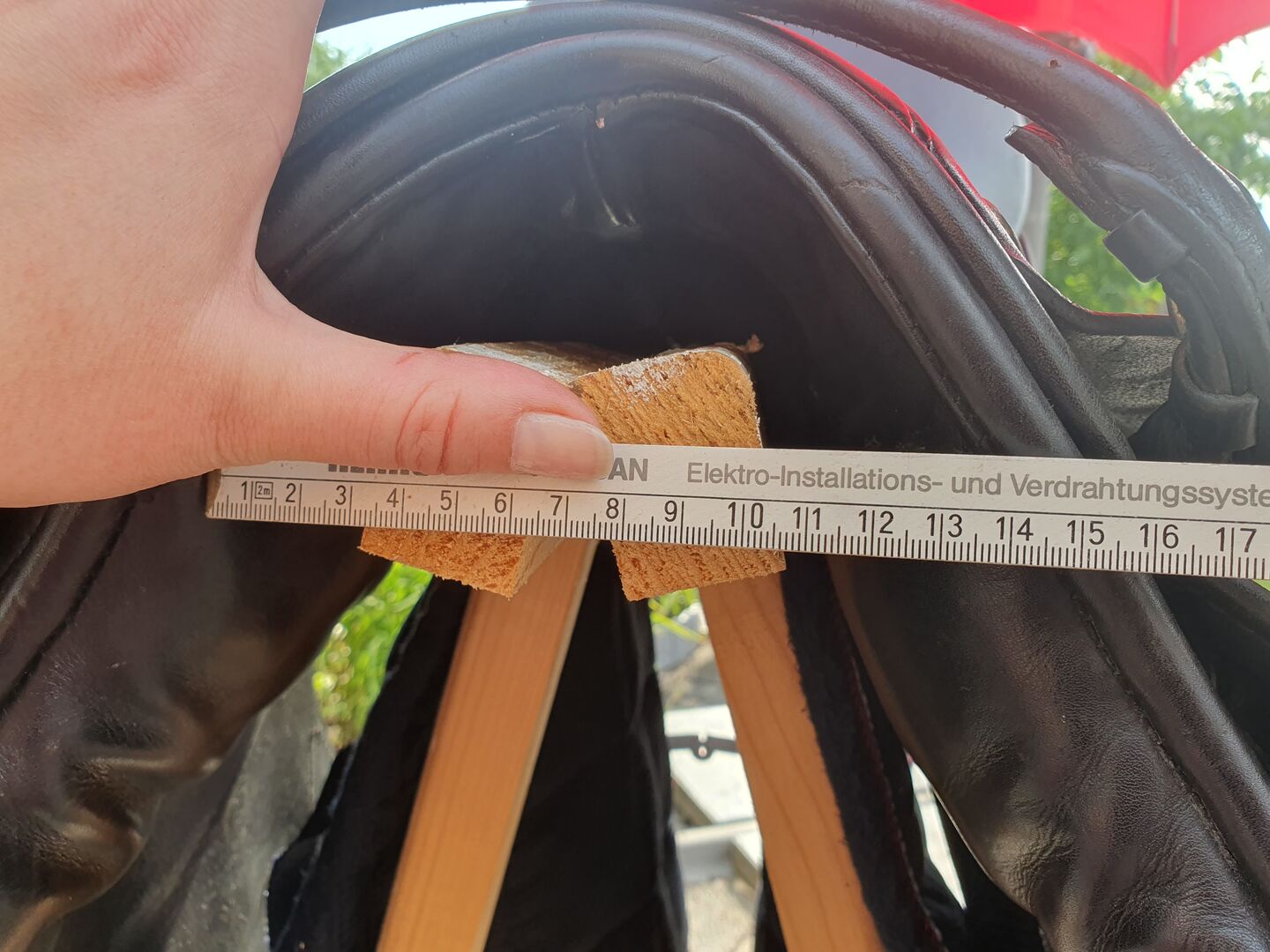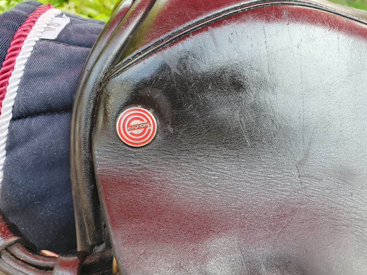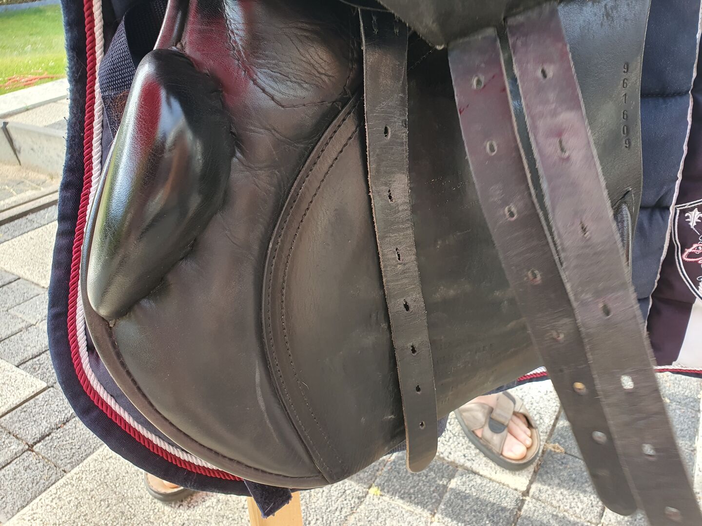 Jest to starszy model z czerwono-srebrnym przyciskiem siodła, ale był bardzo mało używany. Dziewczyna kupiła siodło z drugiej ręki w tym stanie, przedstawiła je rymarzowi i dopasowała do konia. Niestety siodło nigdy nie było używane ze względu na stan zdrowia konia i wisiało przykryte w ogrzewanym pomieszczeniu w domu.