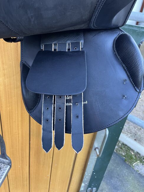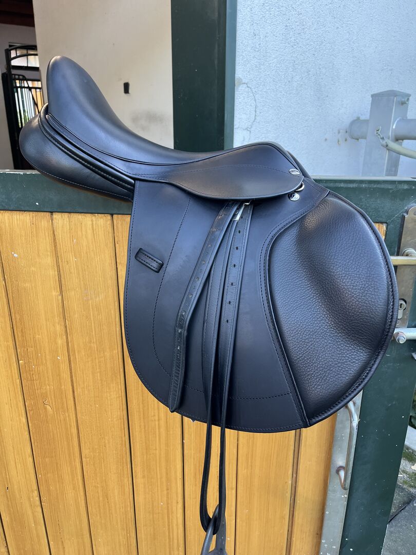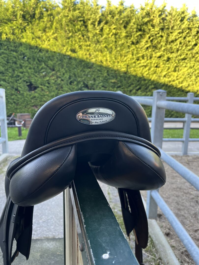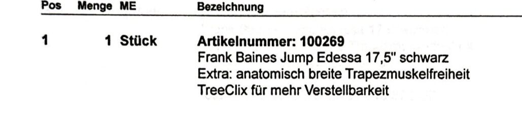 Siodło skokowe Frank Baines - jak nowe - Frank Baines Edessa Siodło zostało zakupione jako nowe we wrześniu 2025 roku. Po ok. 6 tygodniach sprawdzone przez rymarza i profesjonalnie wyściełane. 17,5" Komora: MW (średnio szeroka) Drzewo siodła 5 lat gwarancji, wszystko inne 2 lata gwarancji Nowa cena: 4300 € Faktura może zostać wysłana w razie zainteresowania