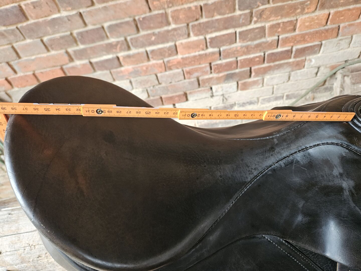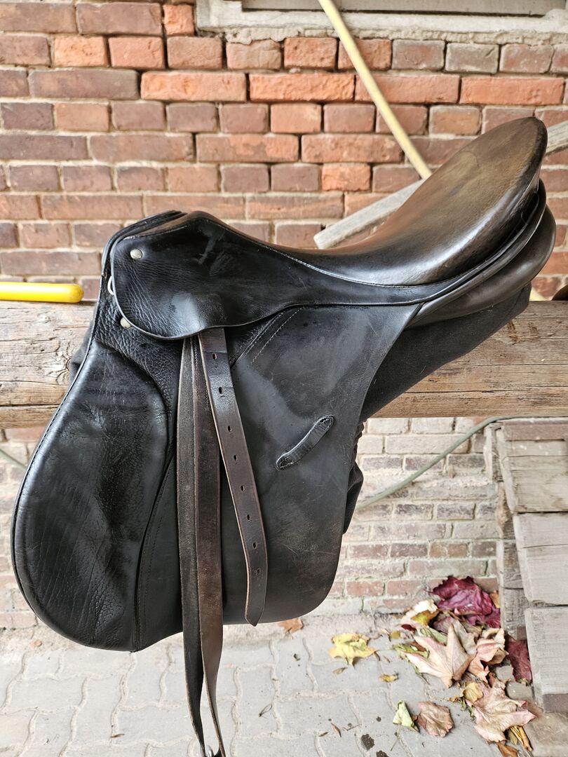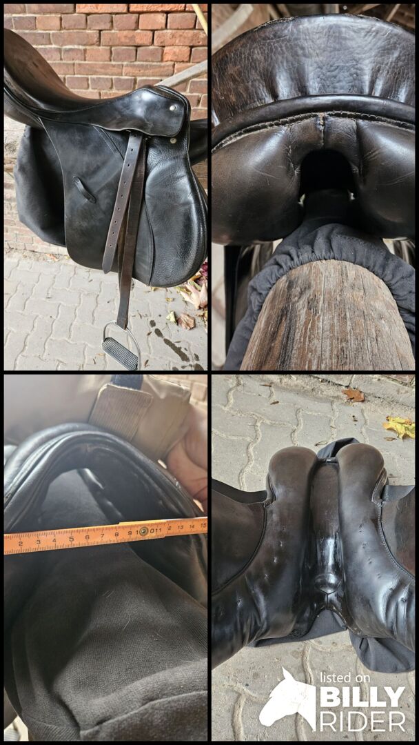 Siodło skokowe G.Passion and Son - Siodło jest nadal w bardzo dobrym stanie, ale nosi ślady użytkowania. Siodło jest dostarczane z pasującym pokrowcem na siodło, podobnie jak strzemiona. Skóry strzemion nie pasują do siodła. Siodło jest wykonane z czarnej skóry, a paski są ciemnobrązowe.