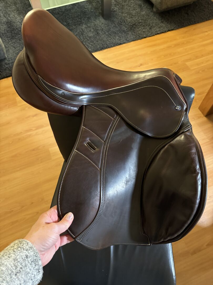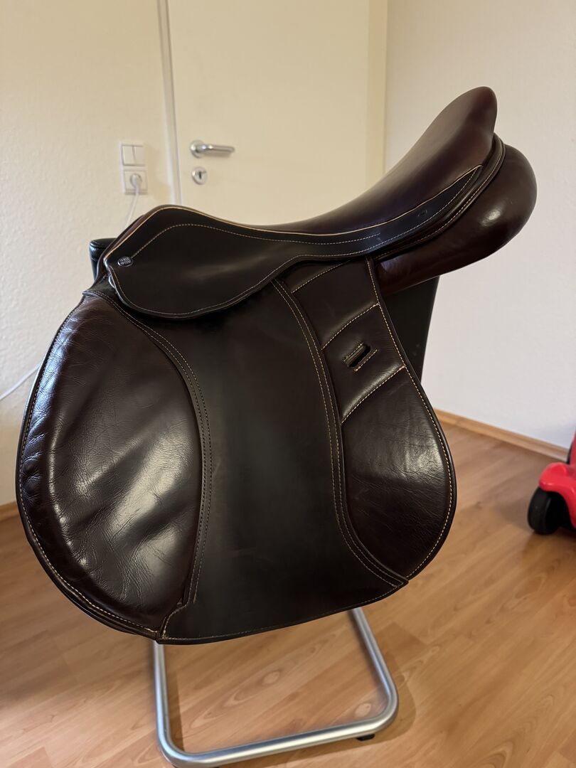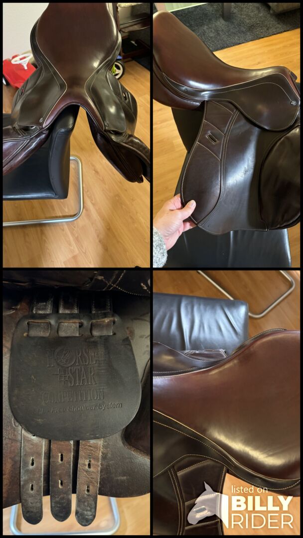 Siodło skokowe Horse Star Competition to płaskie siedzisko z podwyższonymi panelami (K+2). Powierzchnia styku jest lekko podniesiona i dlatego nadaje się również dla koni o wyższym kłębie. Jest również bardziej odpowiednie dla koni z prostym grzbietem i niewielką huśtawką w górnej linii. Wykonane jest z brązowej miękkiej skóry olejowej premium i ma białe kontrastujące szwy.