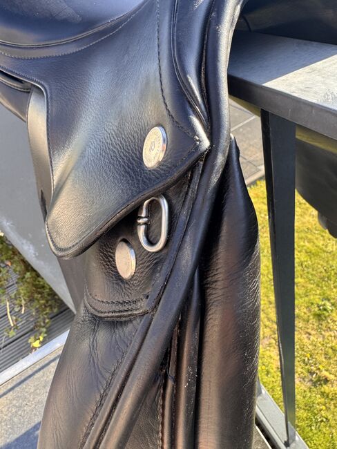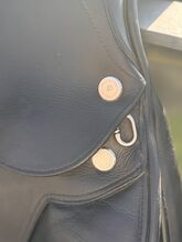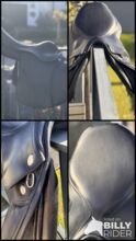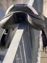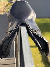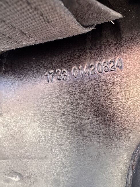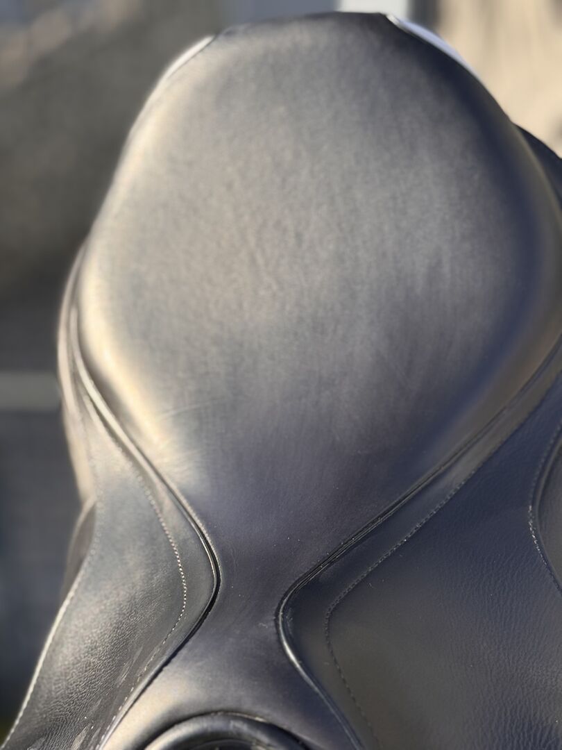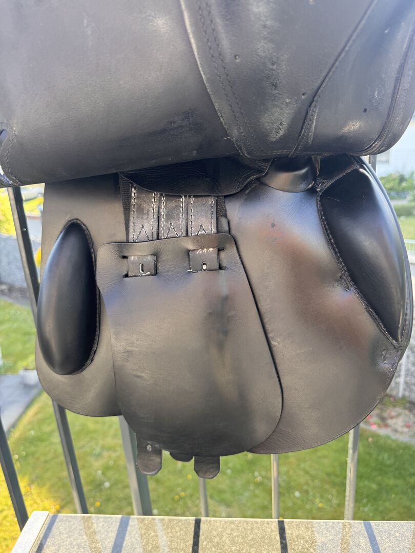 Powierzchnia siedziska: 17 cali Klapa siodła: normalna Szerokość komory: 33 Kolor: czarny Stan: bardzo dobrze utrzymane Skóra: podwójna skóra bydlęca Poduszki: francuskie podwieszane panele bananowe Rolki kolanowe: stałe rolki kolanowe Obwód: krótkie paski obwodu