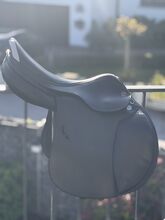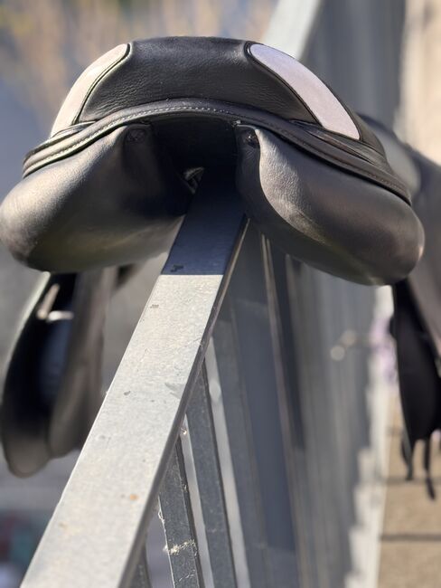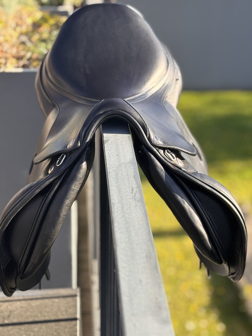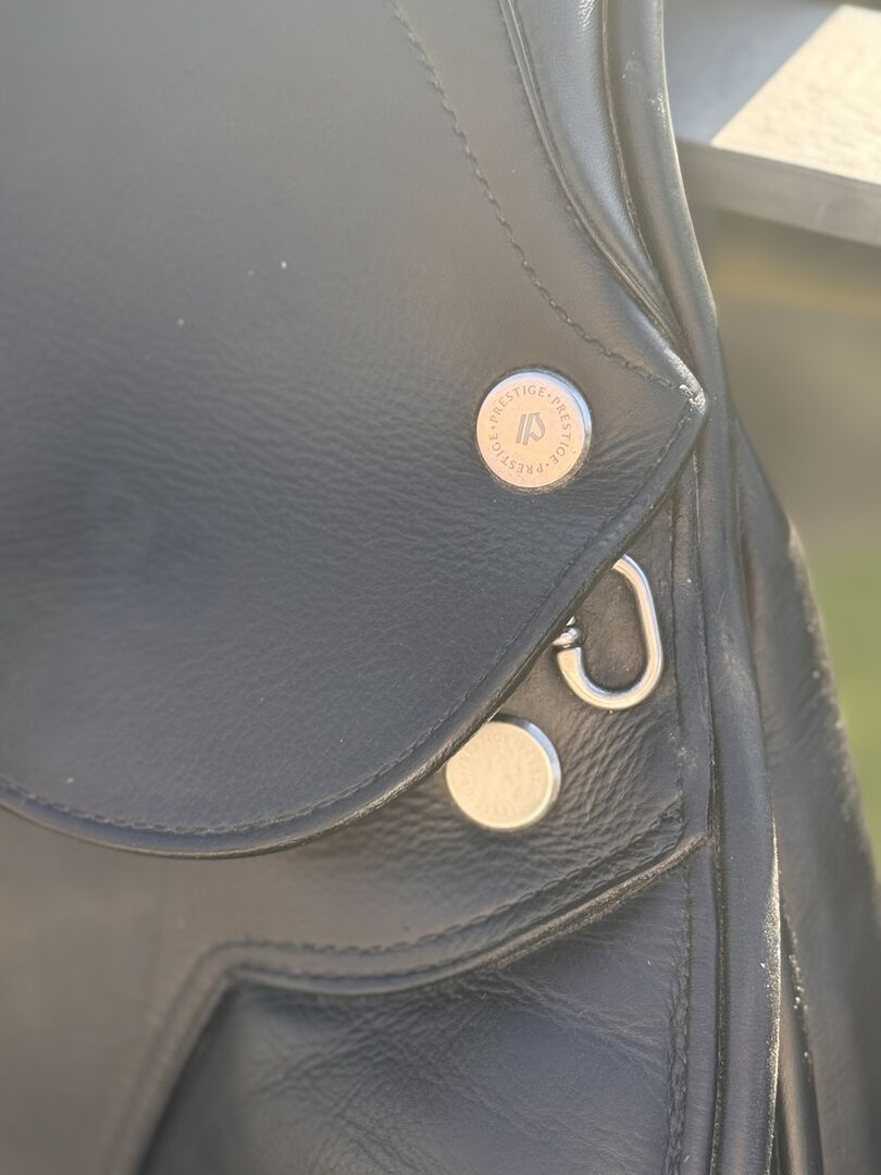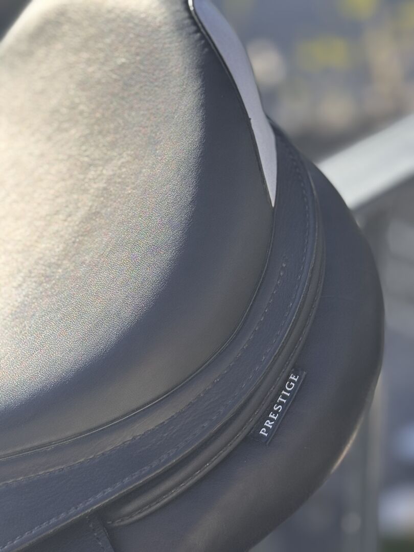 Siodło skokowe Prestige Paris 17"/33 - Na sprzedaż jest czarne siodło skokowe Prestige, model Paris. Siodło zostało zakupione w lutym 2025 r. (NP 2,600 €, faktura dostępna) i od tego czasu nie było zbytnio używane. Widoczne jest tylko niewielkie zużycie w okolicy napierśnika.