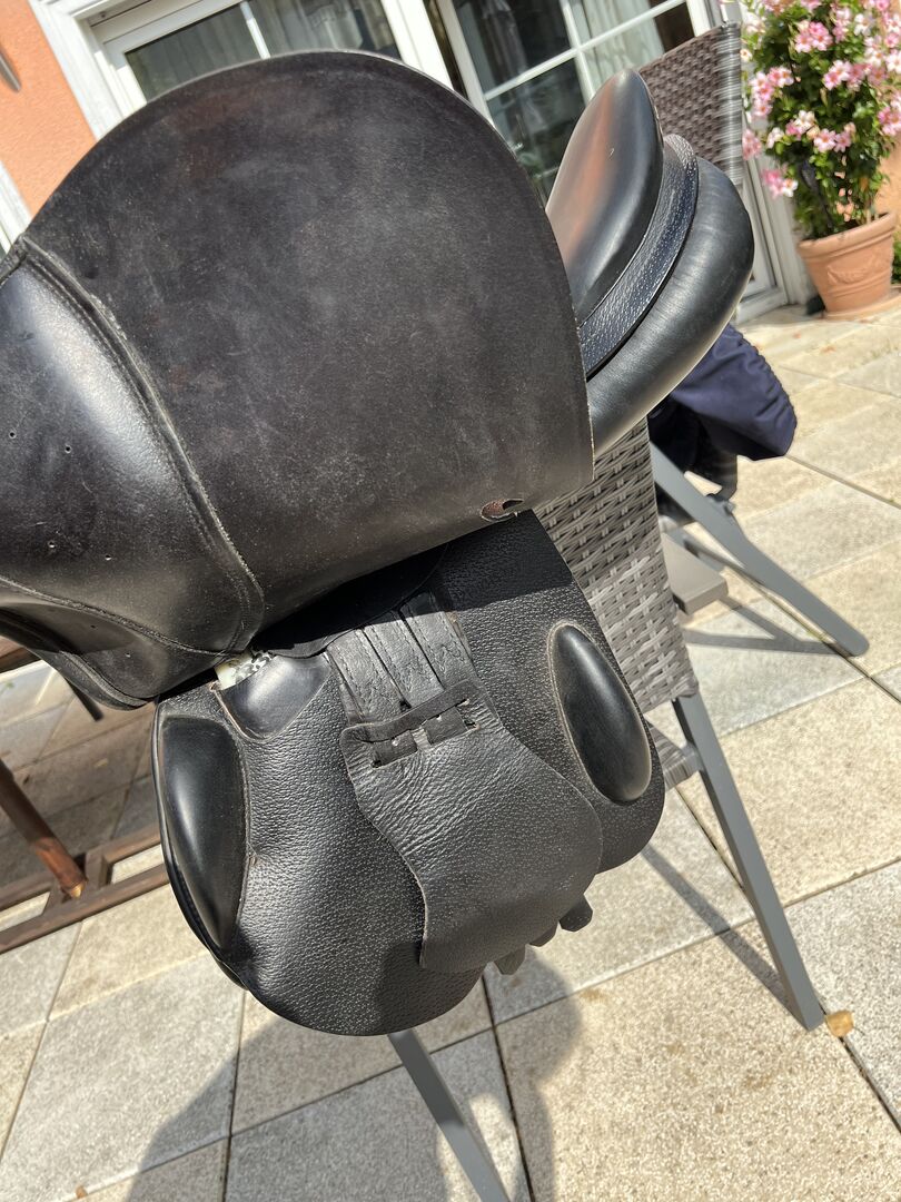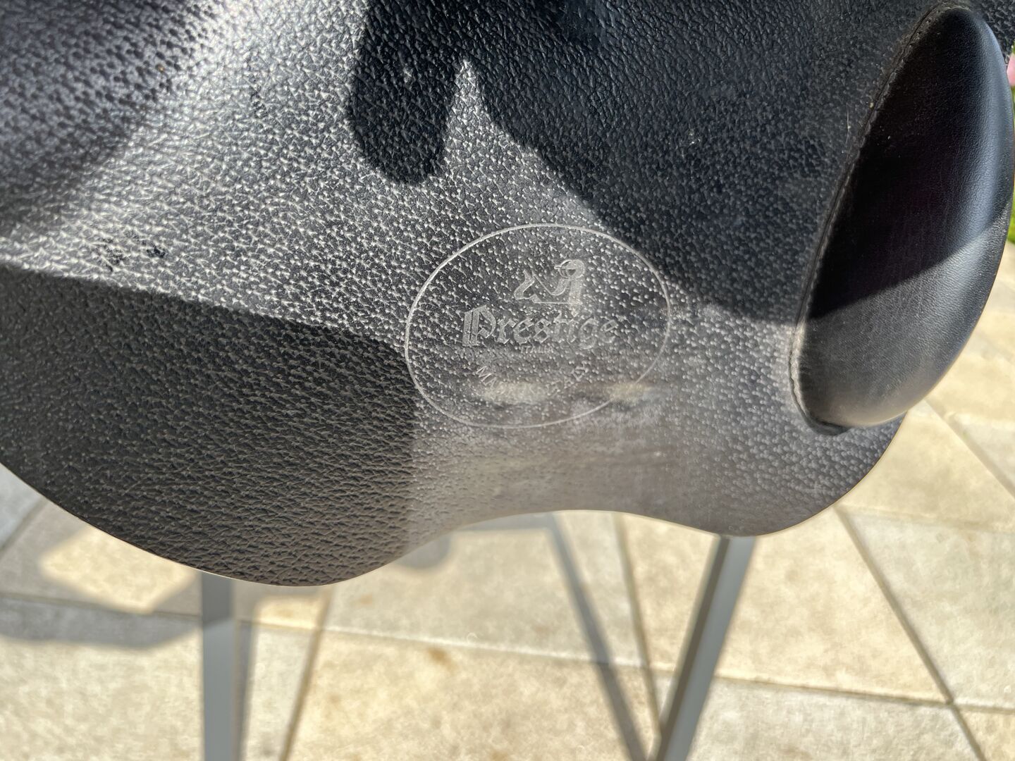 Siodło skokowe Prestige Roma Jump 18 cali bardzo dobrze zachowane - Używane siodło skokowe Prestige Roma Jump w kolorze czarnym jest w bardzo dobrym stanie i jest idealne dla skoczków. Wykonane we Włoszech z wysokiej jakości skóry, siodło ma średnią szerokość komory 32" i rozmiar 18 cali.
