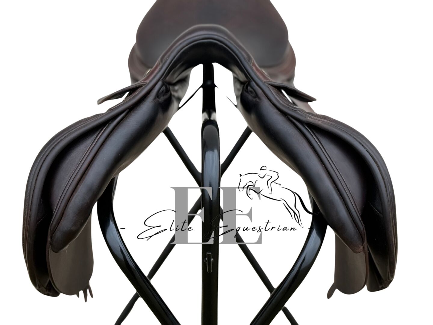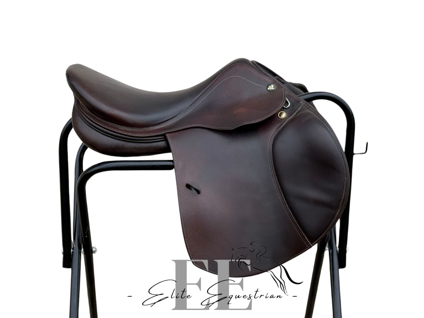 Siodło skokowe Prestige Triomphe 17" - Prestige Triomphe to włoskie siodło skokowe klasy premium zaprojektowane z myślą o maksymalnym komforcie i wydajności. Jest uważane za prawdziwą rzadkość i charakteryzuje się doskonałym wykonaniem i wysokiej jakości materiałami. Jego anatomiczny kształt pomaga jeźdźcowi zachować stabilność i równowagę, a wysokiej jakości skóra zapewnia trwałość i optymalne wsparcie. Elastyczny drewniany łęk dobrze dopasowuje się do grzbietu konia i umożliwia swobodny ruch bez ograniczania mięśni. Ergonomicznie ukształtowane rolki kolanowe promują prawidłowe ułożenie nóg, dzięki czemu siodło jest idealne dla jeźdźców skokowych. Najlepiej nadaje się dla koni o lekko zakrzywionym grzbiecie i średnim kłębie, dzięki czemu jest wszechstronne zarówno do zawodów, jak i codziennego treningu.