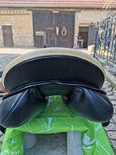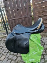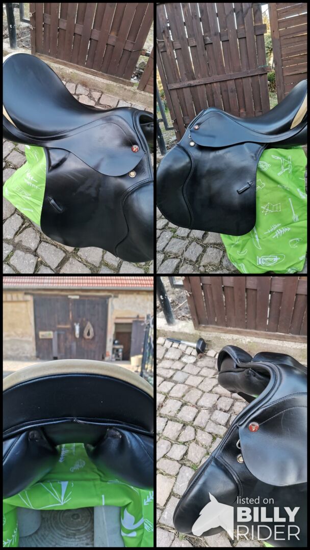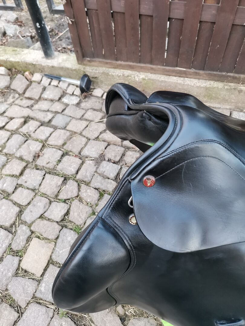 Siodło skokowe Prestige Venezia z panelem klinowym - Na sprzedaż piękne bezpieczne siodło skokowe Prestige Model Venezia z panelami klinowymi z powodu przejścia naszych koni na emeryturę. Dzięki panelom klinowym siodło idealnie leży na wszystkich końskich grzbietach, bez względu na to, jak trudne. Paski wyściełające i łęk są w idealnym stanie Komora 33 Siedzisko 17