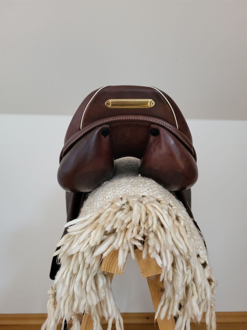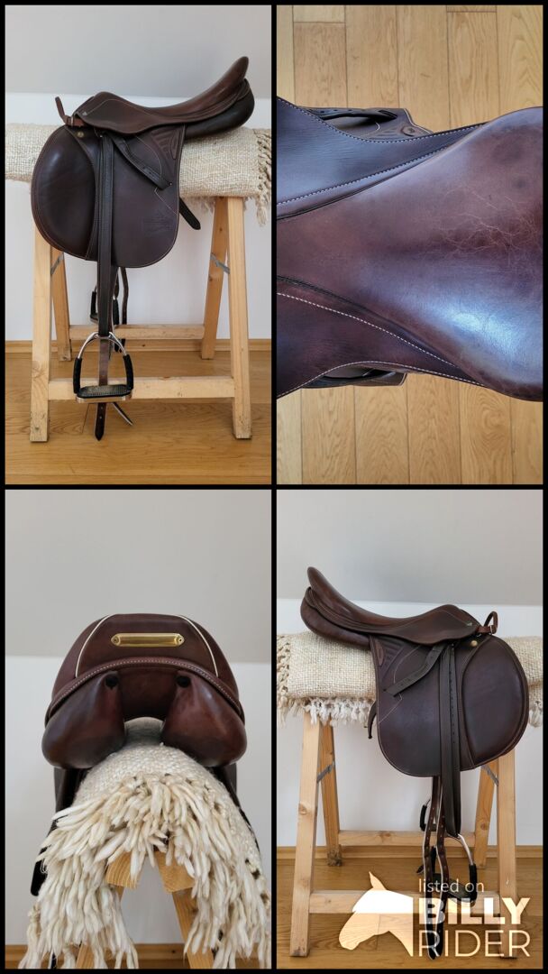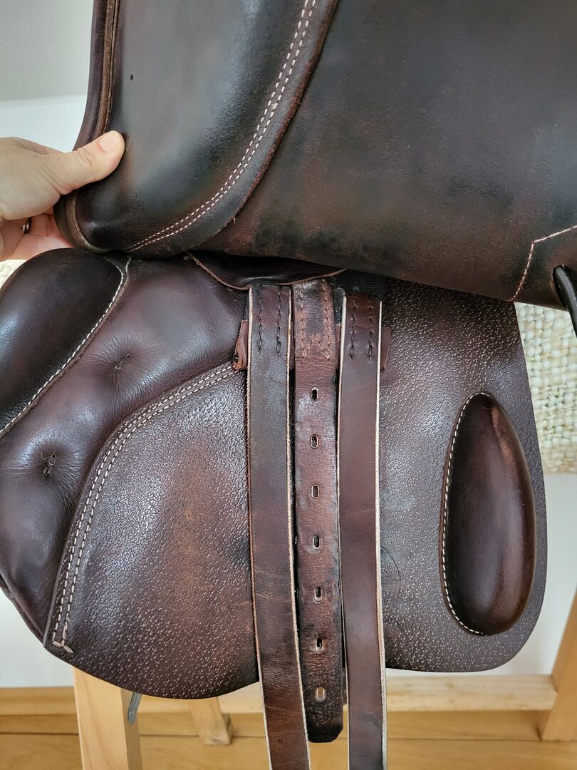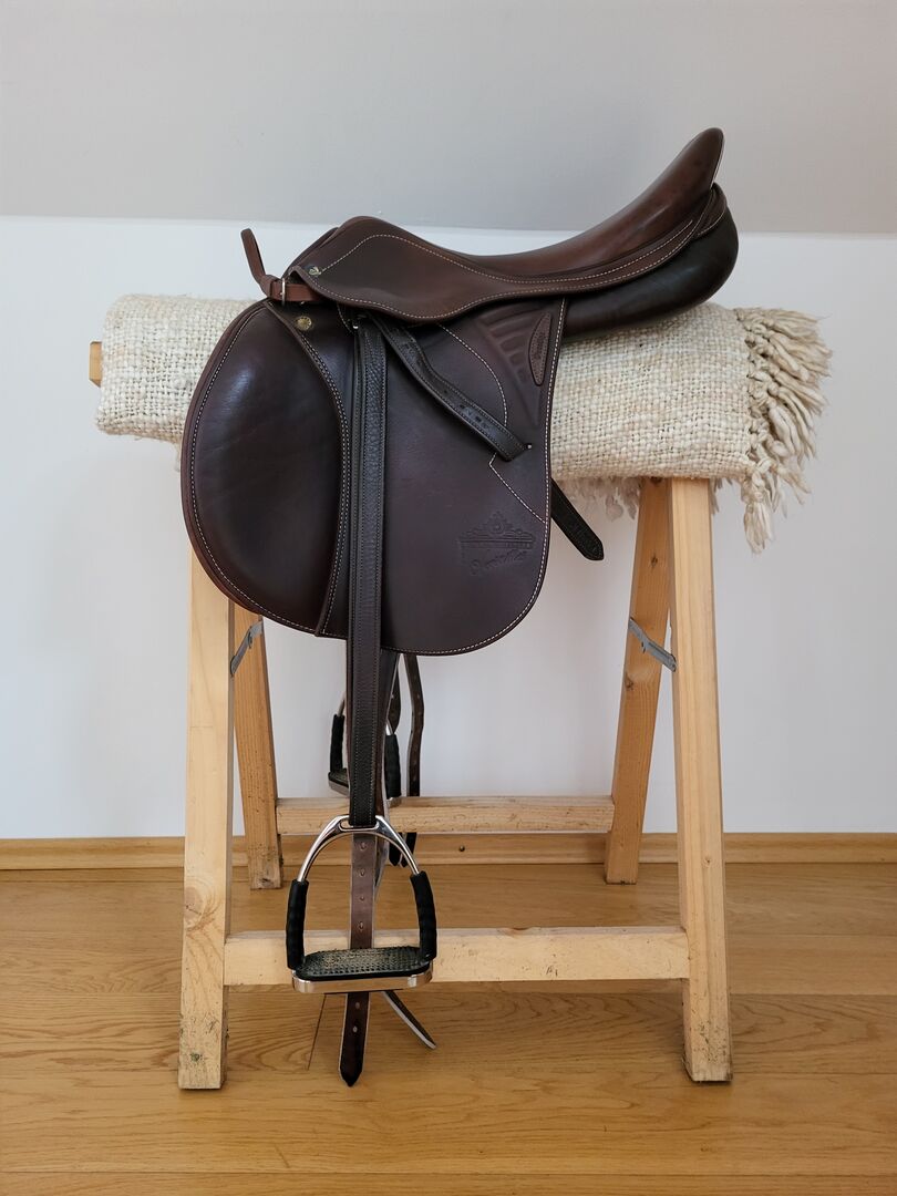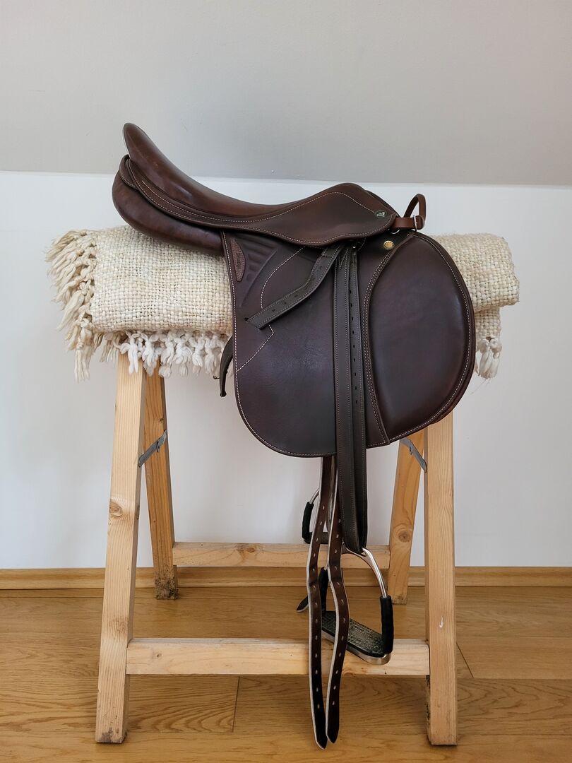 Siodło skokowe Prestige Versaille w kolorze tabacco - Sprzedaję moje mało używane siodło skokowe firmy Prestige. Krótkie uzdy zostały zastąpione długimi do krótkich popręgów. W komplecie pasujące skóry strzemion Passier i strzemiona HS Sprenger.