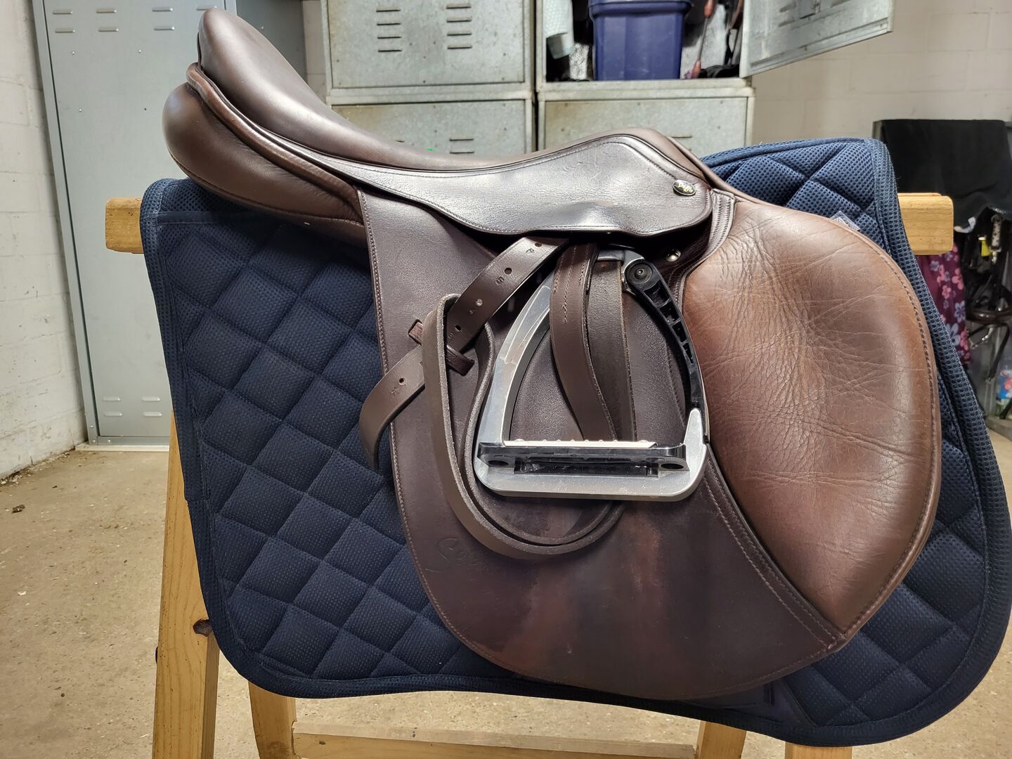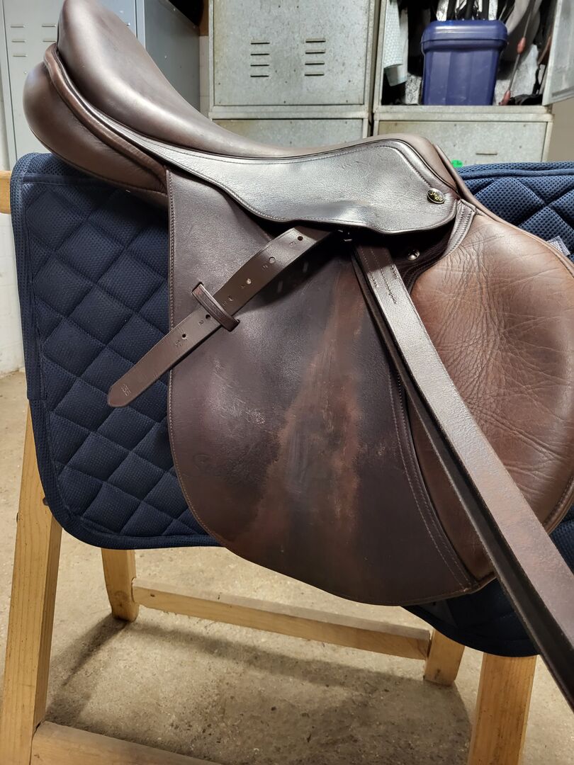 Siodło skokowe Seabis Model Aachen 17,5" - Sprzedaję moje siodło firmy SeaBis model Aachen, które jest w bardzo dobrym stanie. Siodło ma siedzisko 17,5 cala i obecnie posiada płytkę gulletową odpowiadającą szerokości gulleta 32-33. Płyta przepuklinowa może być łatwo zmieniona przez jeźdźca i w ten sposób dostosowana do konia. Mam tu jeszcze zapasowy gullet w jednym rozmiarze większym, który dodałbym do zakupu. Siodło zostało świeżo wyścielone przez mojego rymarza wiosną 2022 roku. Siodło zawsze było zadbane i regularnie smarowane, więc ślady zużycia są w granicach (patrz zdjęcia). W razie jakichkolwiek pytań proszę o kontakt!