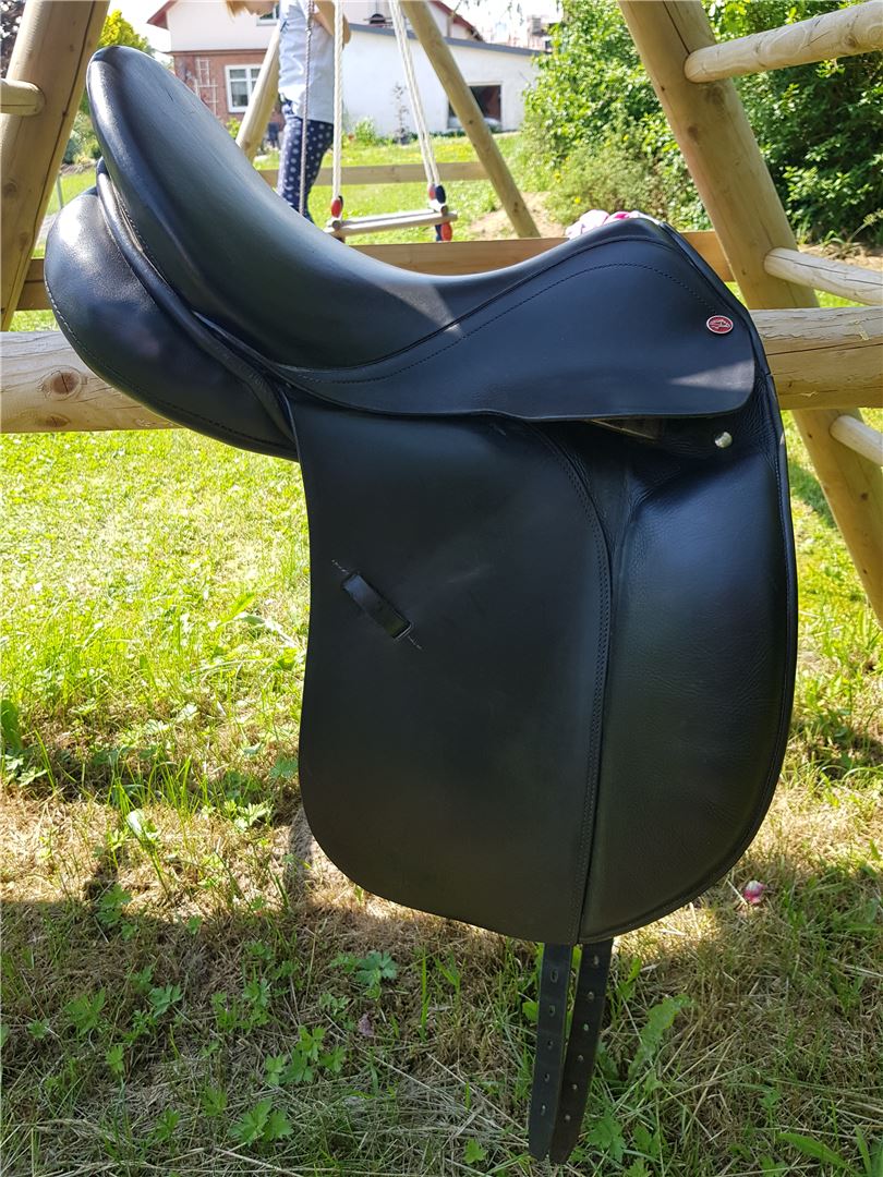 Siodło ujeżdżeniowe - Sprzedaję moje dobrze utrzymane siodło. Posiada normalne ślady użytkowania i nie jest uszkodzony. Kolor jest rozjaśniony na nogawce i siedzeniu, co nie jest zauważalne podczas jazdy. Szew na klapie siodła pochodzi z pętli, przez którą przechodził pasek od pasa. Jest on wyściełany watą. Siedzenie 17,5 i średnia komora. Według rymarza podobna konstrukcja jak w przypadku Stübben Skandika.