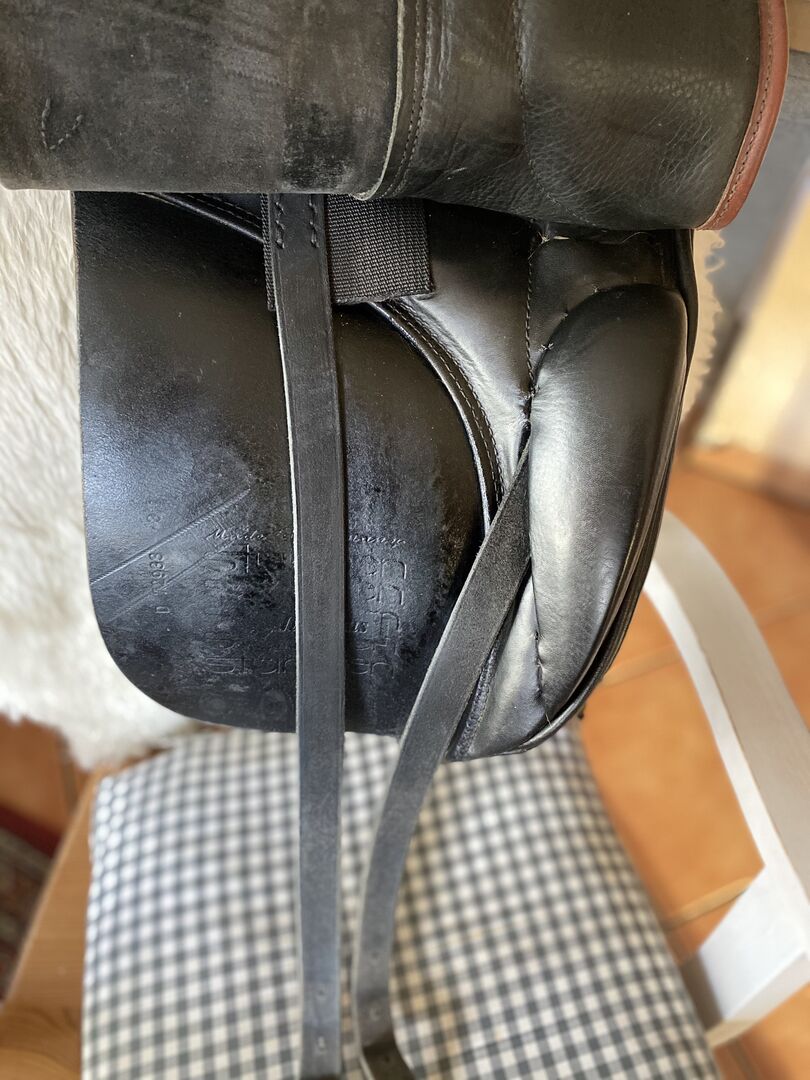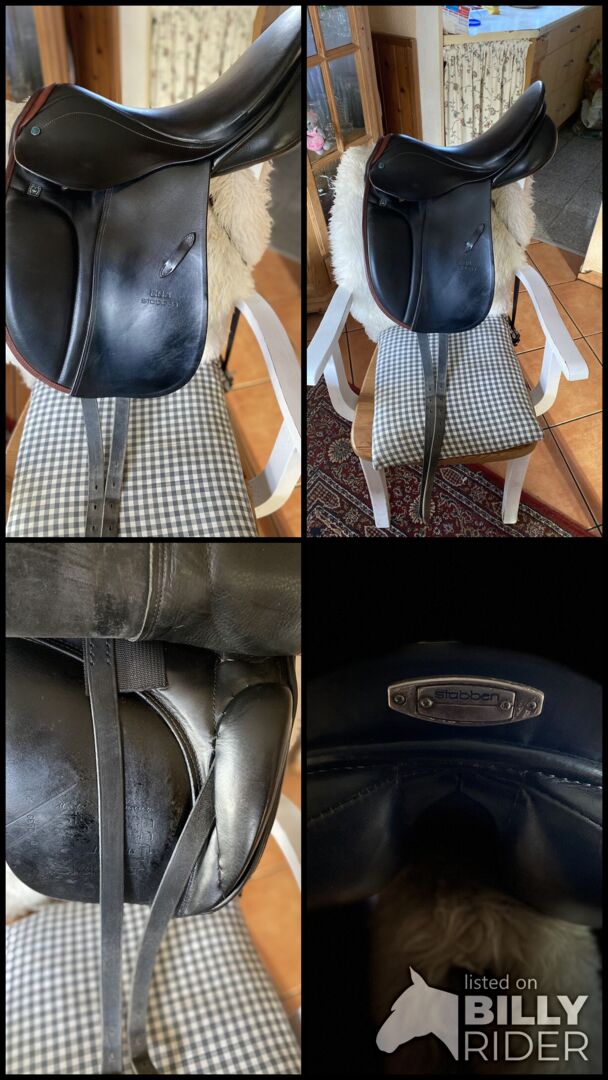 Siodło ujeżdżeniowe - Młodzieżowe siodło ujeżdżeniowe 16,5 cala szerokość puślisk ok. 32, długość ok. 40-42 cm Siodło ujeżdżeniowe Stübben Juventus, bardzo ładne odcienie kolorów z brązowymi paskami, jest młodzieżowym siodłem ujeżdżeniowym