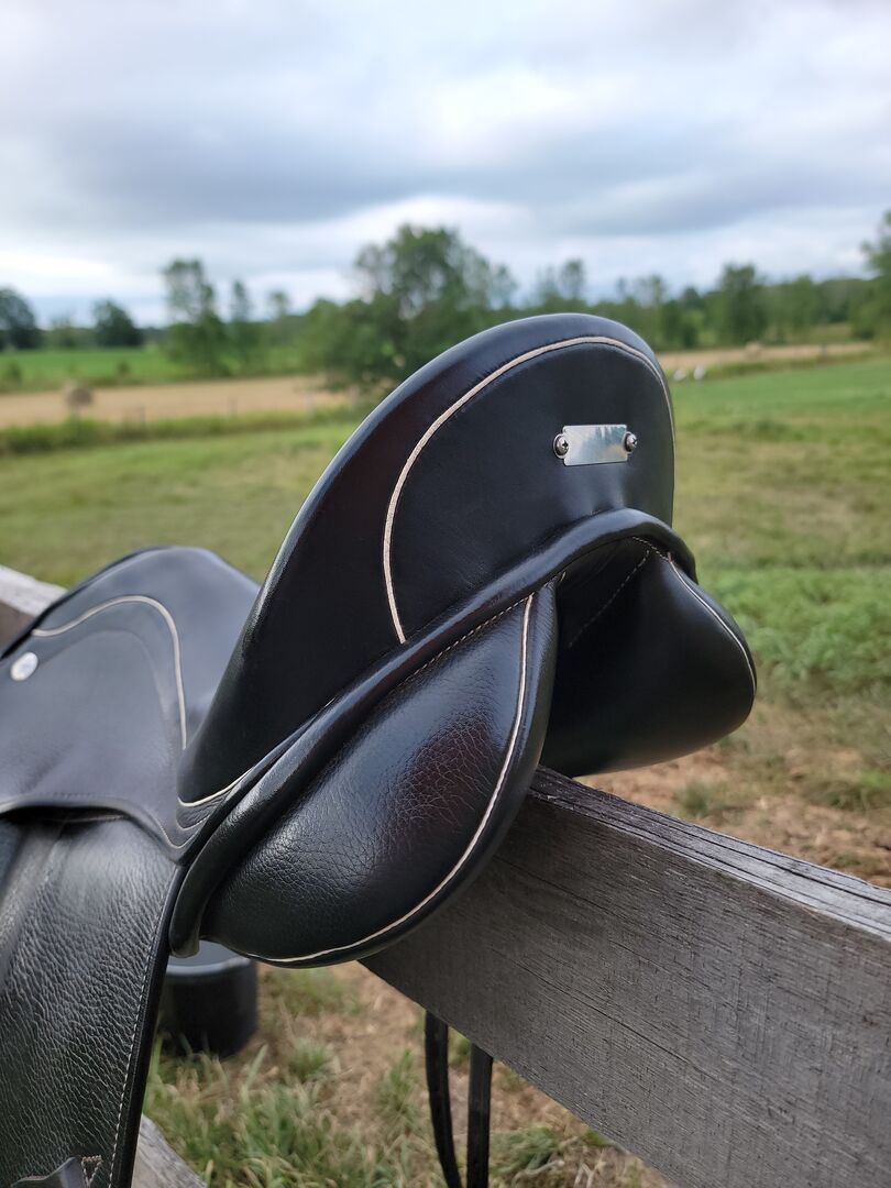 17" seat, 40cm flap length, anatomical cut-out panels. White piping with blank name plate. Adjustable tree currently set to MW. (32cm)
