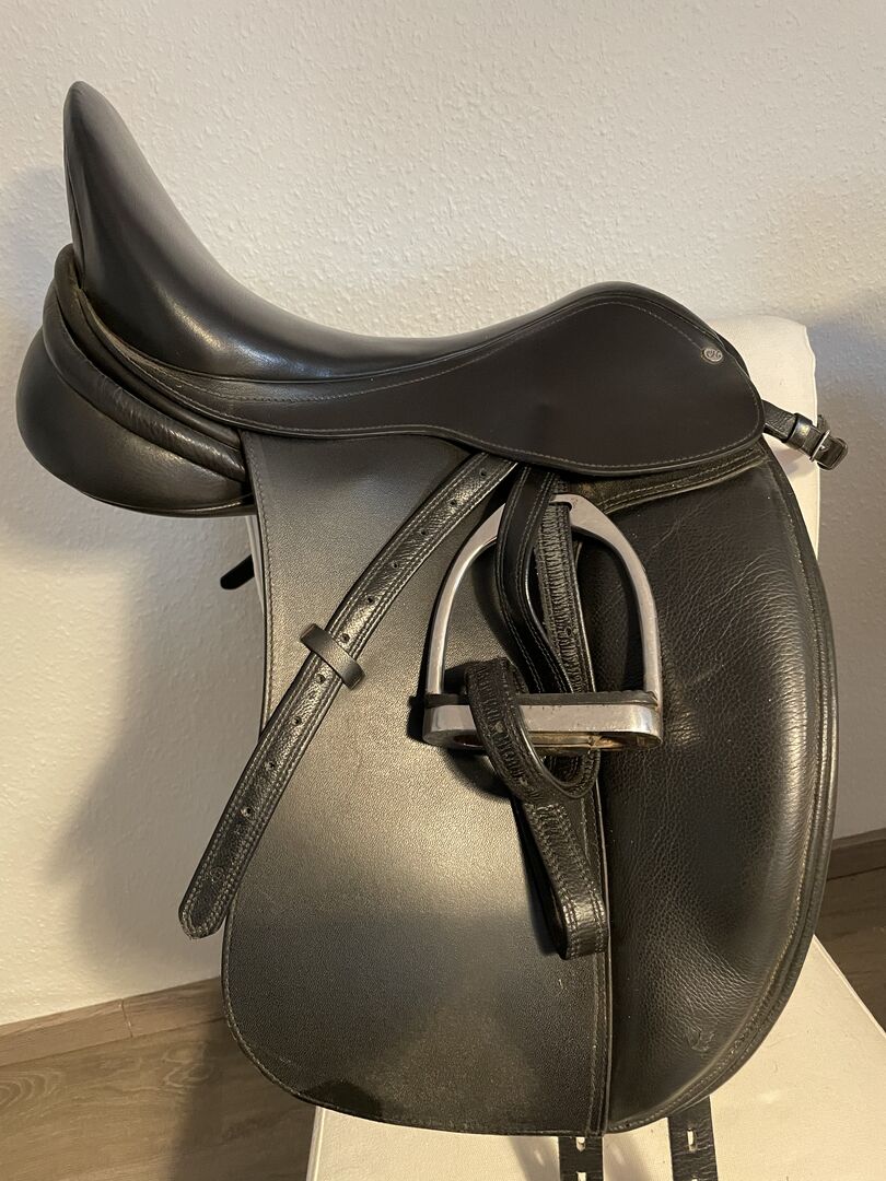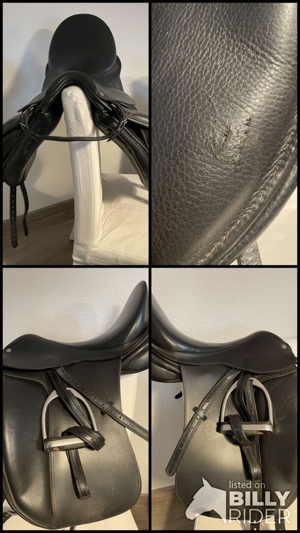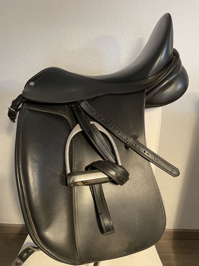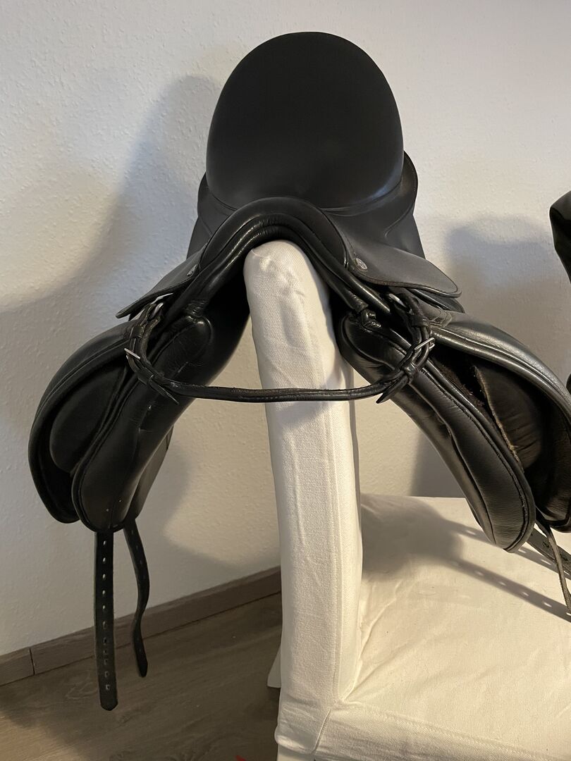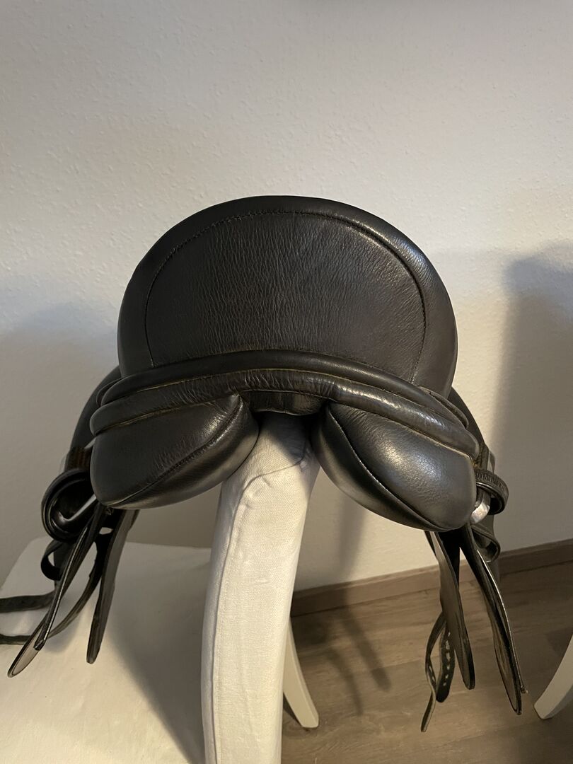 Siodło ujeżdżeniowe 17,5 - Mam do sprzedania prawie nowe siodło ujeżdżeniowe. Właśnie wrócił do rymarza, aby sprawdzić panele, ale niestety nadal nie pasuje na moją klacz w 100%, ponieważ powierzchnia styku jest trochę za długa. Posiada wymienną płytkę wpustową, obecnie znajduje się w niej płytka jasnoniebieska, która odpowiada normalnej komorze (30 cm). Płyta wpustu jest bardzo łatwa do wymiany.