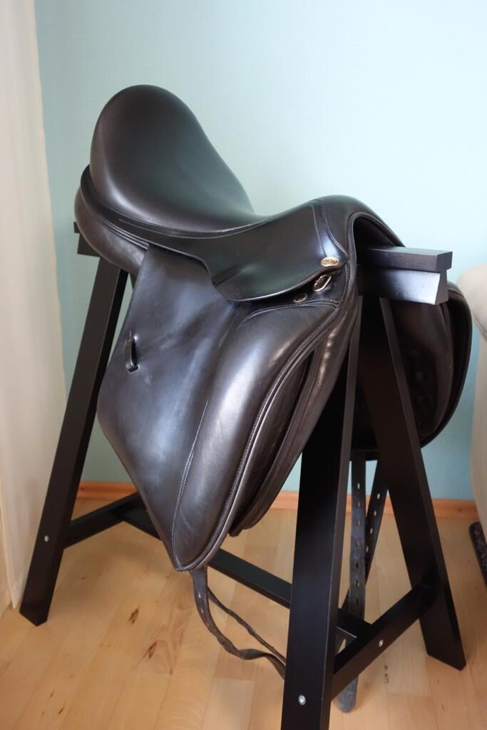 Siodło ujeżdżeniowe 18" - Sprzedam bardzo dobrze zachowane siodło ujeżdżeniowe Cobra w rozmiarze 18". Ma krótszą klapę siodła. Z tego względu bardzo dobrze nadaje się do krótkich nóg. Ma on już około 10 lat. Na moim koniu był tylko przez 3 lata, a na poprzednim jeźdźcu przez rok. Obecnie znajduje się w dobrym magazynie u rymarza. Można nawiązać kontakt w celu dopasowania siodełka. Za kaucją można też wziąć siodło na próbę. Kupiłam go dla mojej 4-letniej klaczy, która wyrosła z niego po 3 latach. Jednak komora jest stosunkowo szeroka, oceniłbym ją na 32/33. Można je jednak nadal dostosowywać indywidualnie. Siodło również było przez cały czas modyfikowane przez firmę Cobra. W razie jakichkolwiek pytań, proszę pytać.