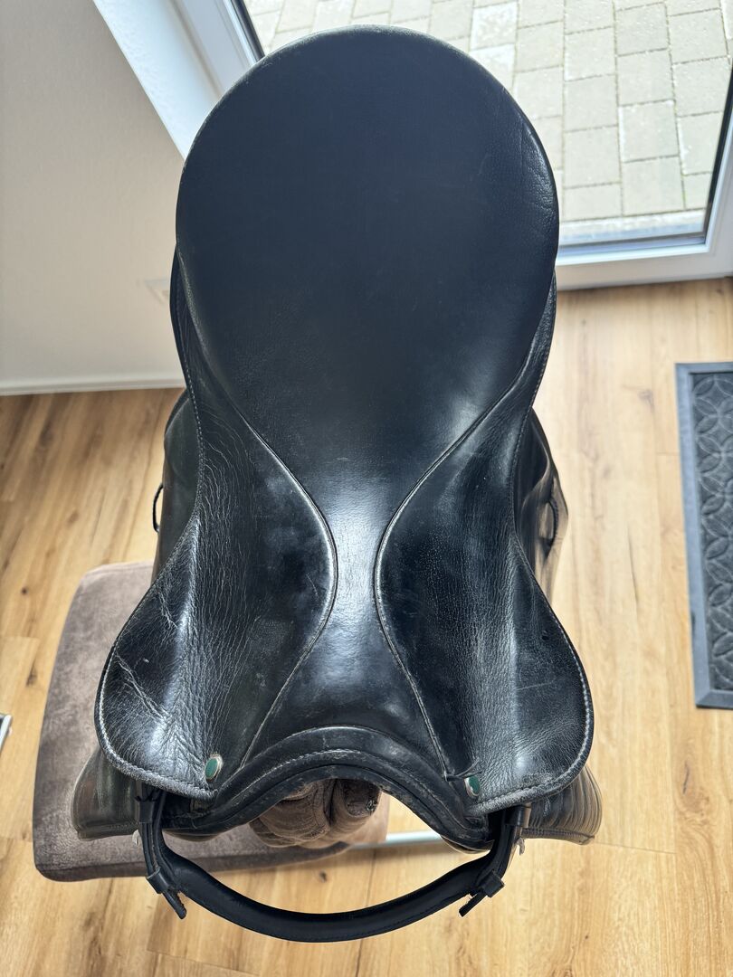 Siodło ujeżdżeniowe - Sprzedaję dobrze używane siodło ujeżdżeniowe. Niestety nie mogę powiedzieć o nim zbyt wiele, ponieważ siodło przyszło z koniem, kiedy go przejąłem i pasowało idealnie. Siodło było na klaczy pełnej krwi irlandzkiej o wzroście 1,55 cm i drobnej, sportowej sylwetce.