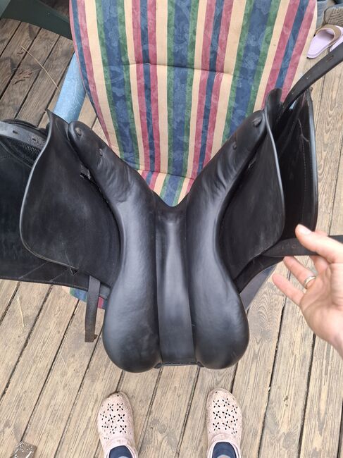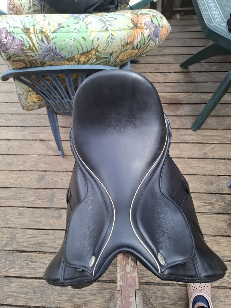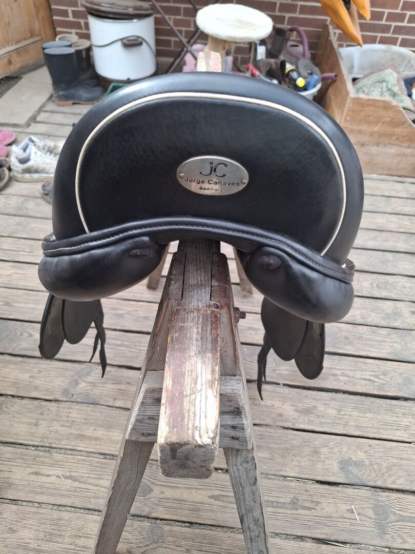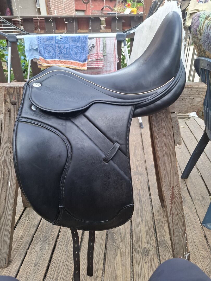 Siodło ujeżdżeniowe - Oferuję moje super wygodne siodło ujeżdżeniowe, ponieważ mój koń wyrósł z marki John Canaves rozmiar siedziska to 17,5 i szerokość komory 34 kolor czarny w razie jakichkolwiek pytań proszę o kontakt. Bez gwarancji i bez możliwości zwrotu