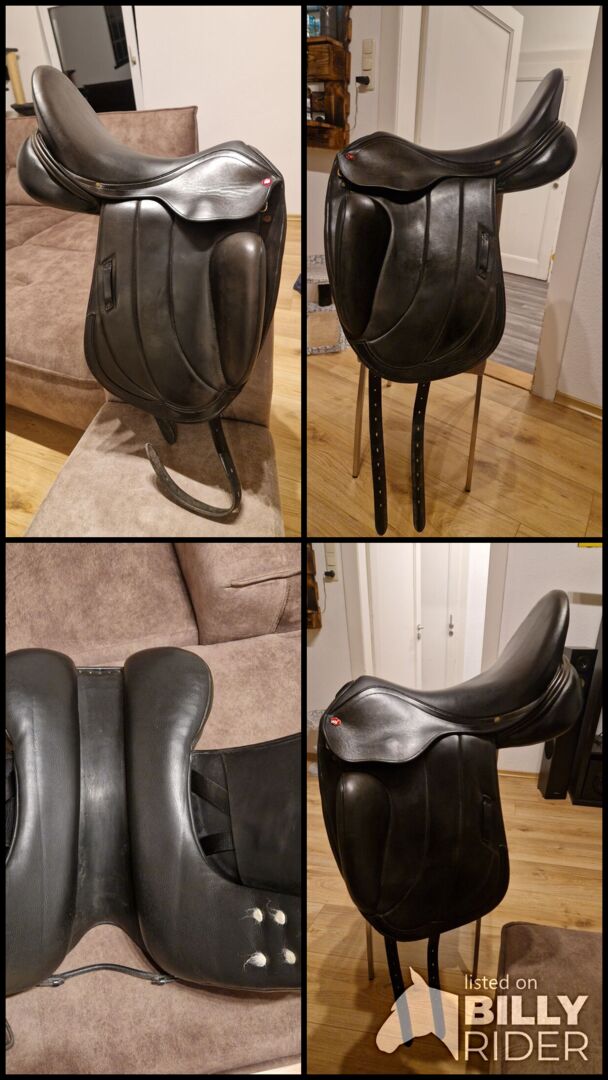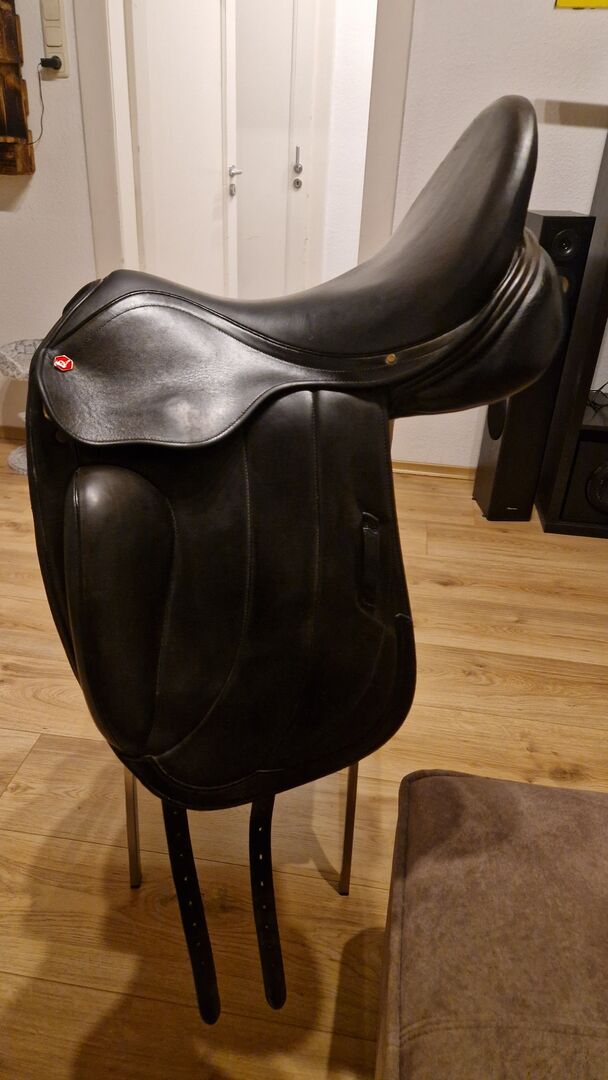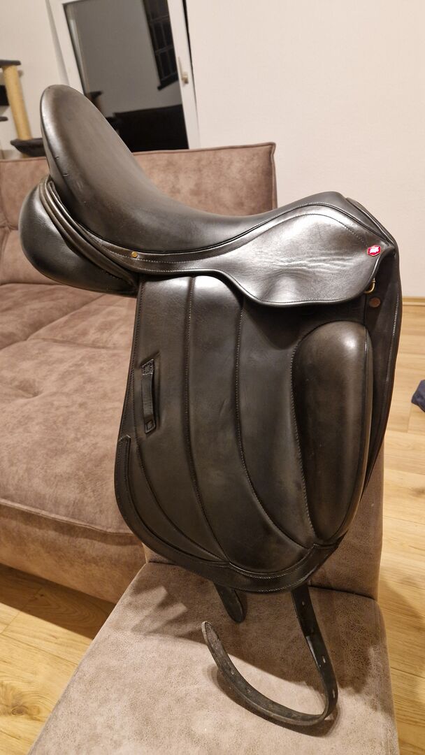 Siodło ujeżdżeniowe Albion Fabrento 18 cali - Sprzedaję moje siodło ujeżdżeniowe Albion Fabrento w rozmiarze 18. Siodło kupiłam 3,5 roku temu z moją klaczą, ale nie czuję się w nim komfortowo z powodu grubych wałków kolanowych. Siodło zawsze było zadbane. Siodło ma małe pęknięcie na lewej klapie siodła (patrz zdjęcia).