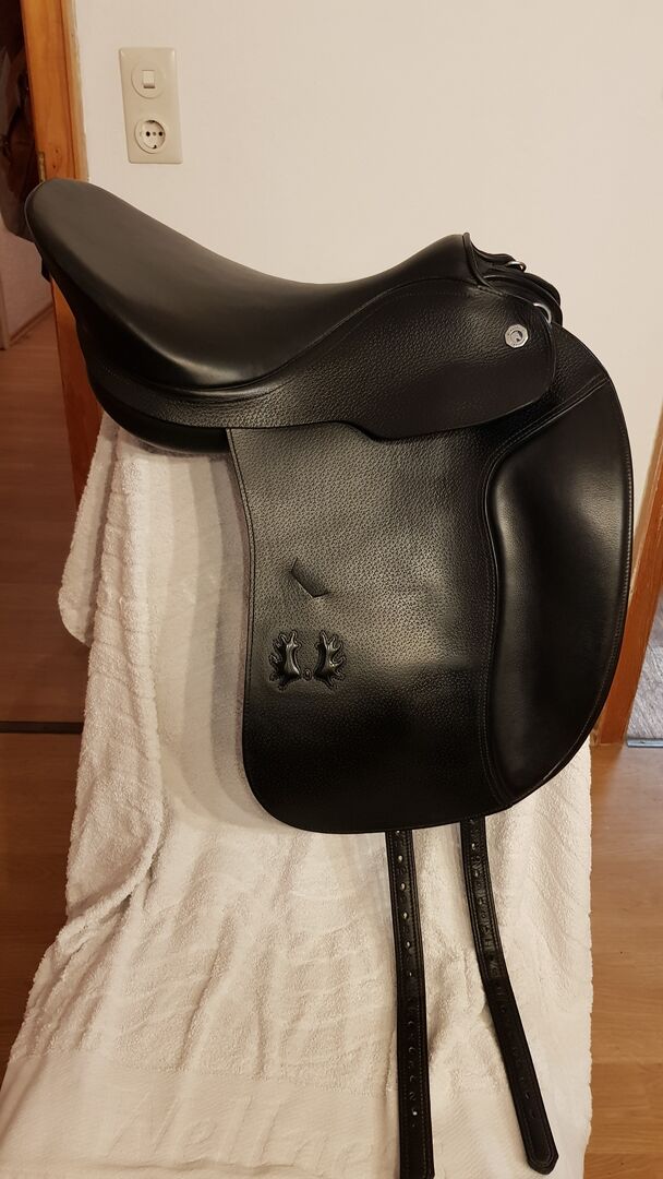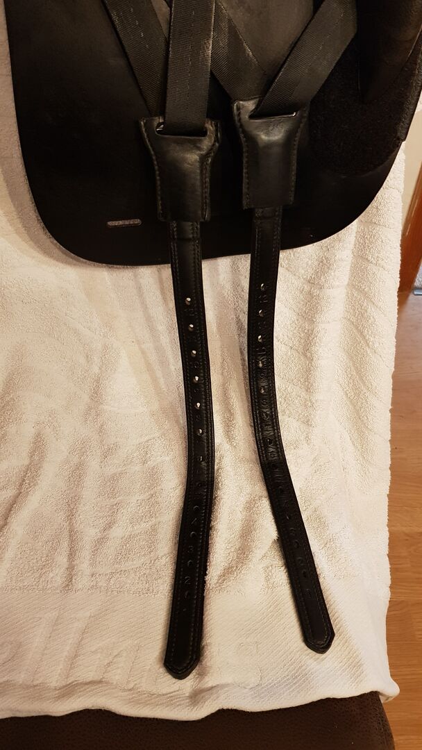 Siodło ujeżdżeniowe Butterfly Kostolany Dt Saddlery - Oferuję moje Kostolany, rozmiar 18 cali, czarne, z typowym systemem zawiasów motylkowych i mostkami zamiast normalnego naczółka, które niestety nie pasują już na mojego konia. Niestety na brzegu siodełka jest rysa (patrz zdjęcie), poza tym stan bardzo dobry, wymiary - patrz zdjęcia. Możliwa wysyłka, gotówka przy odbiorze lub PayPal, montaż możliwy po wpłacie zaliczki na poczet ceny zakupu. Lokalizacja to 56766 Auderath, a nie Horperath... niestety nie mogę tego zmienić....