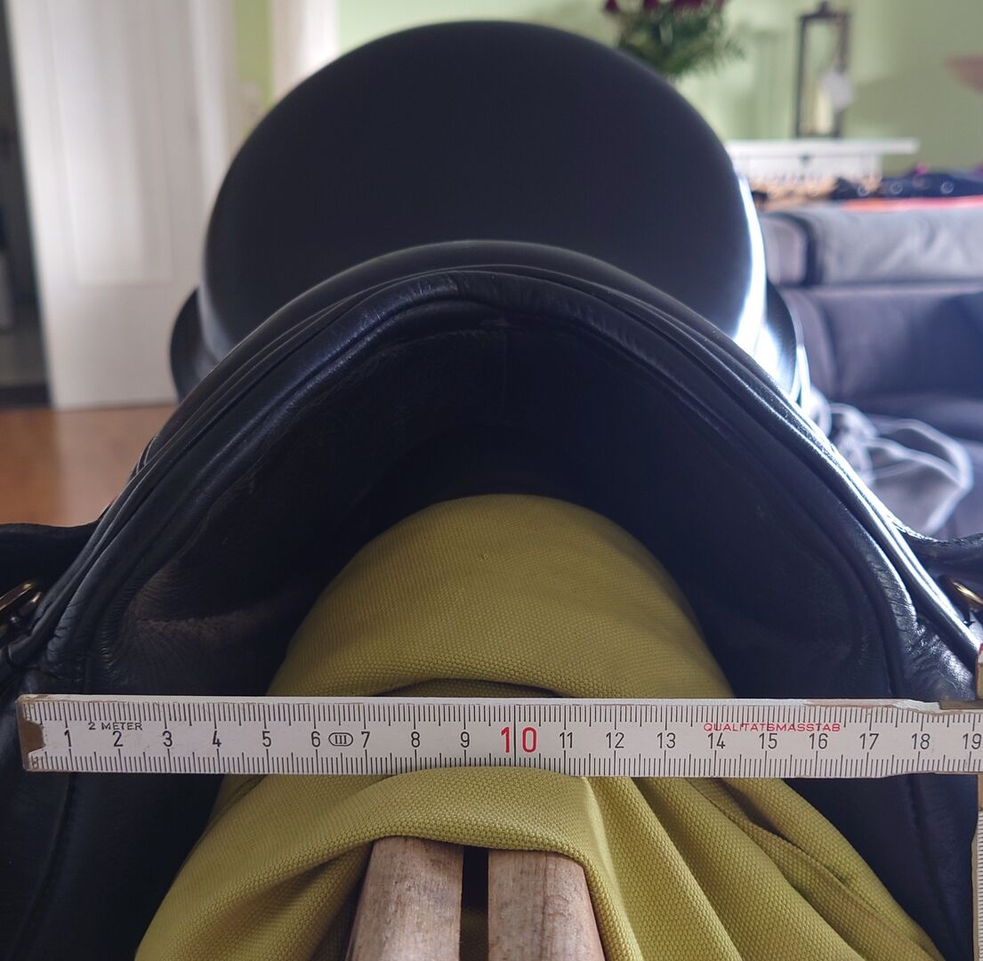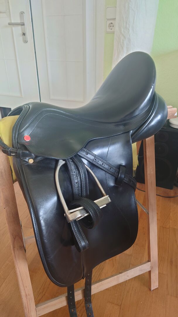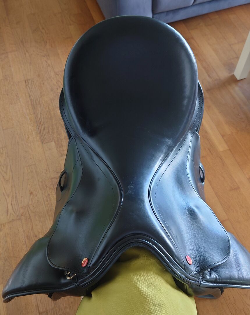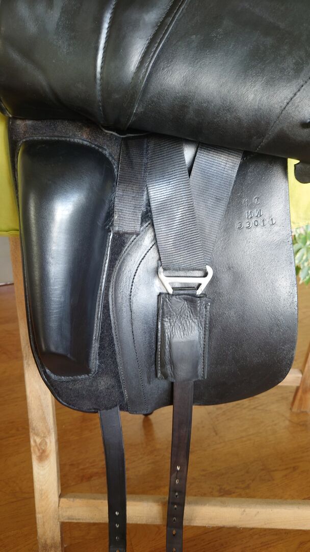 Siedzisko: 17 cali Klapa siodła: normalna Szerokość zatoki: MW (33,5), regulowana Wypełnienie panelu: wełna Kolor: czarny Stan: bardzo dobry z niewielkimi śladami użytkowania Skóra: podwójna skóra cielęca Pommele: Pomosty na rzepy Siedzenie: blisko konia długie pasy do pasa, z oryginalnym pokrowcem na siodło