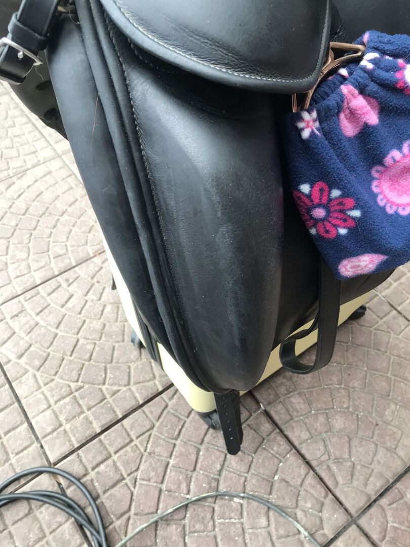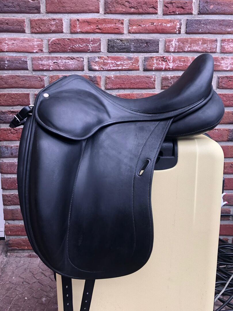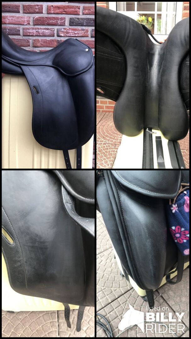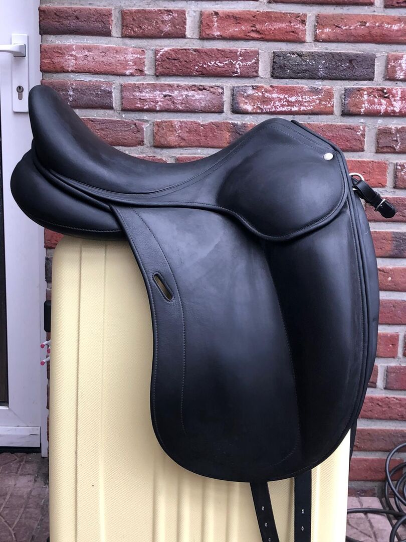 Siodło wyposażone jest we francuskie panele klinowe!!! Był dosiadany na wąskim, krótkim ogierze z wysokim kłębie. Jest w bardzo dobrym stanie, zawsze było przechowywane w ochraniaczu na siodło i czyszczone przy użyciu środka do pielęgnacji siodeł Childeric. Widoczne są normalne ślady użytkowania, patrz zdjęcia. Paski zostały odnowione w 2020 r. Bez pasków pomocniczych maria.