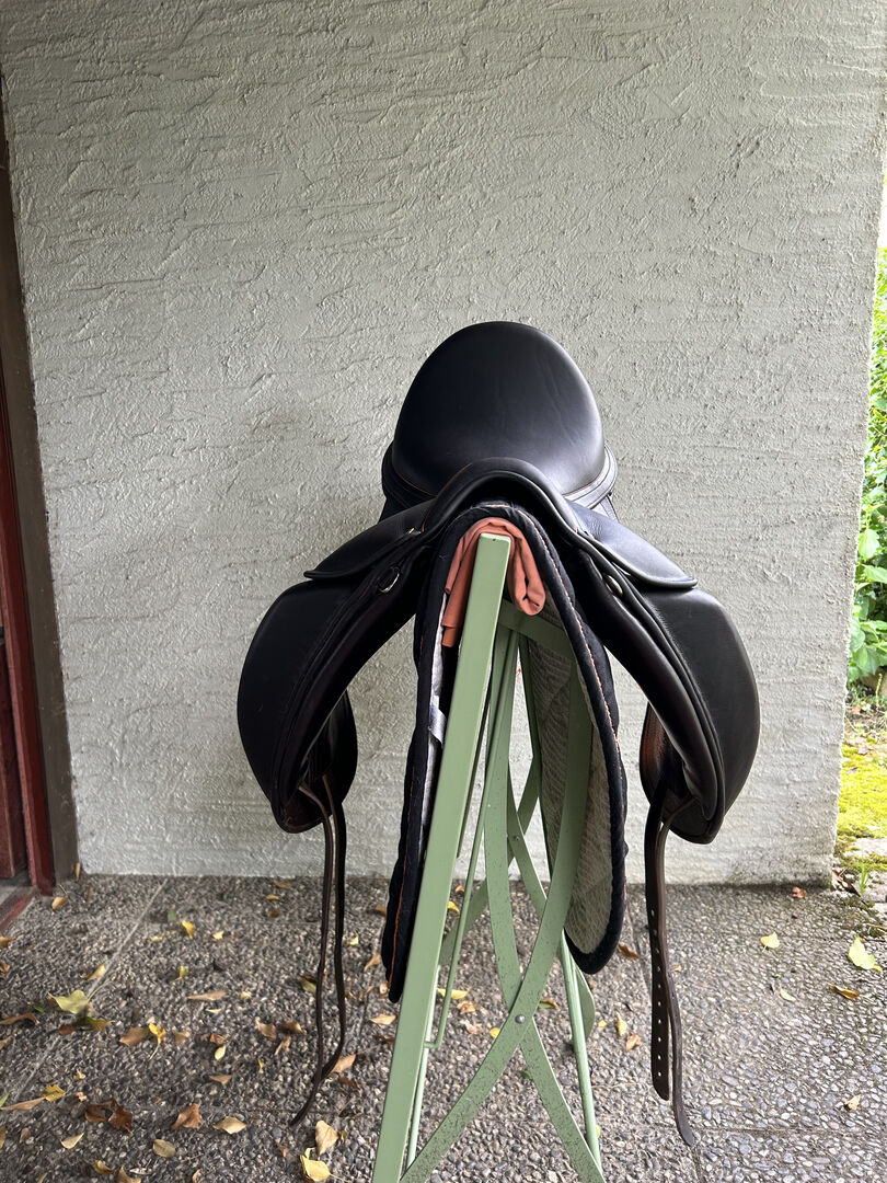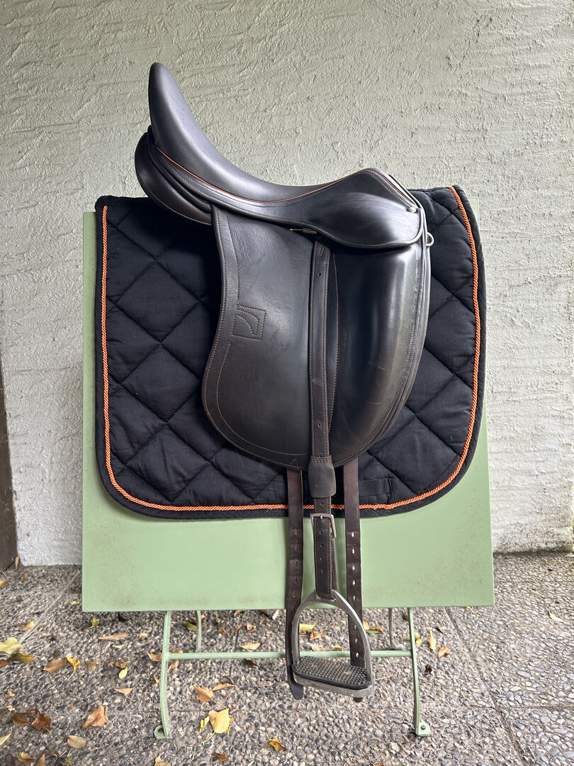 Siodło ujeżdżeniowe Childeric DSG, 17,5'', najlepszy stan - Sprzedam bardzo ładne siodło ujeżdżeniowe francuskiej marki Luc Childeric. Wygodne siodło pozwala na ścisłe dopasowanie do konia, a jakość skóry zapewnia dobrą przyczepność i głębokie siedzisko. Siodło było regularnie i starannie pielęgnowane, profesjonalnie przechowywane i nie wykazuje prawie żadnych śladów użytkowania. Sprzedaż obejmuje strzemiona, popręg, pokrowiec ochronny, podkładkę pod siodło Childeric (nowa cena 5'300.- CHF).