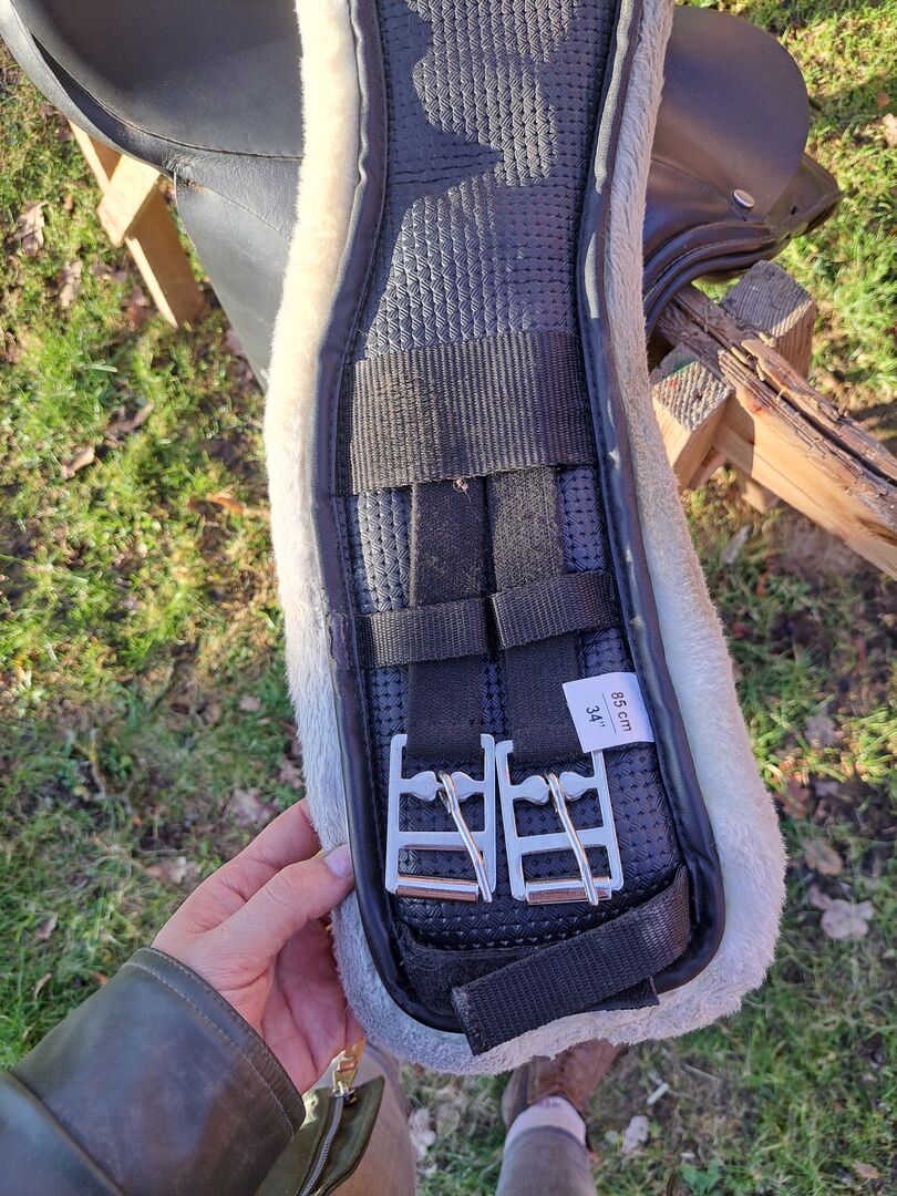 Siodło ujeżdżeniowe czarne - Sprzedaję to mało używane siodło ujeżdżeniowe. Przejęłam je, kiedy kupiłam konia, ale teraz go nie potrzebuję, ponieważ kupiłam nowe siodło skokowe. Strzemiona i popręg (85 cm) będą wliczone w cenę.