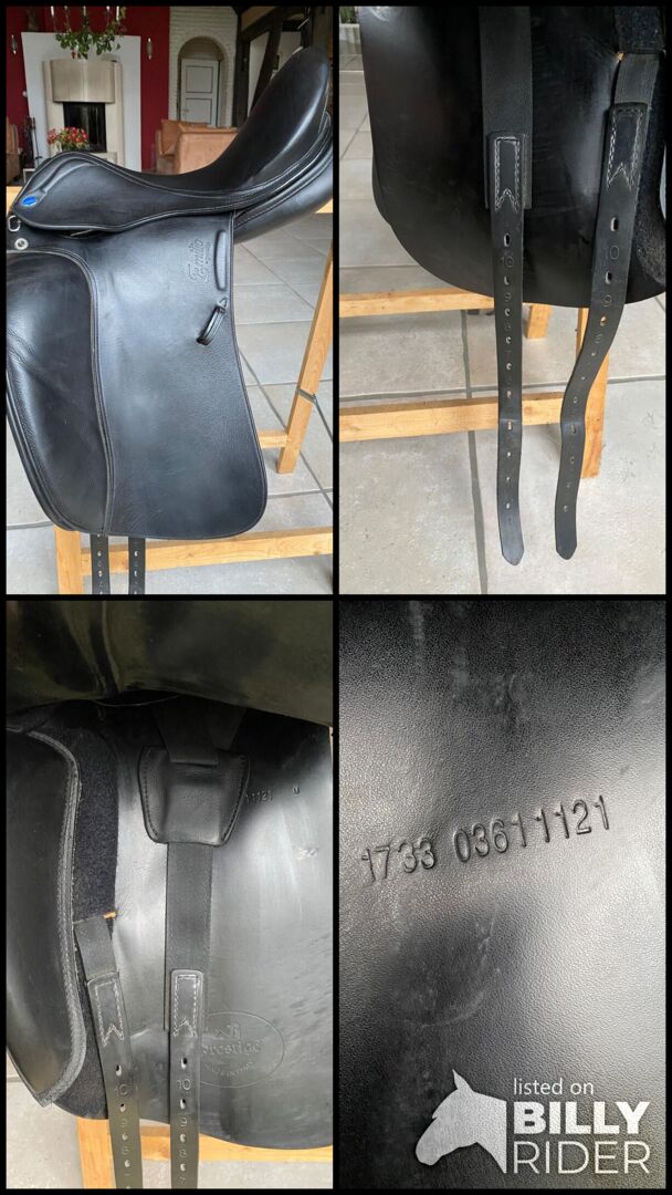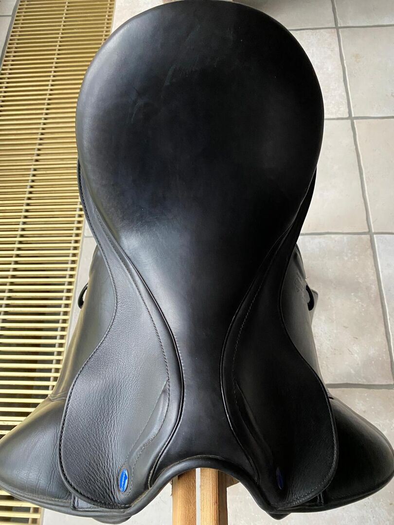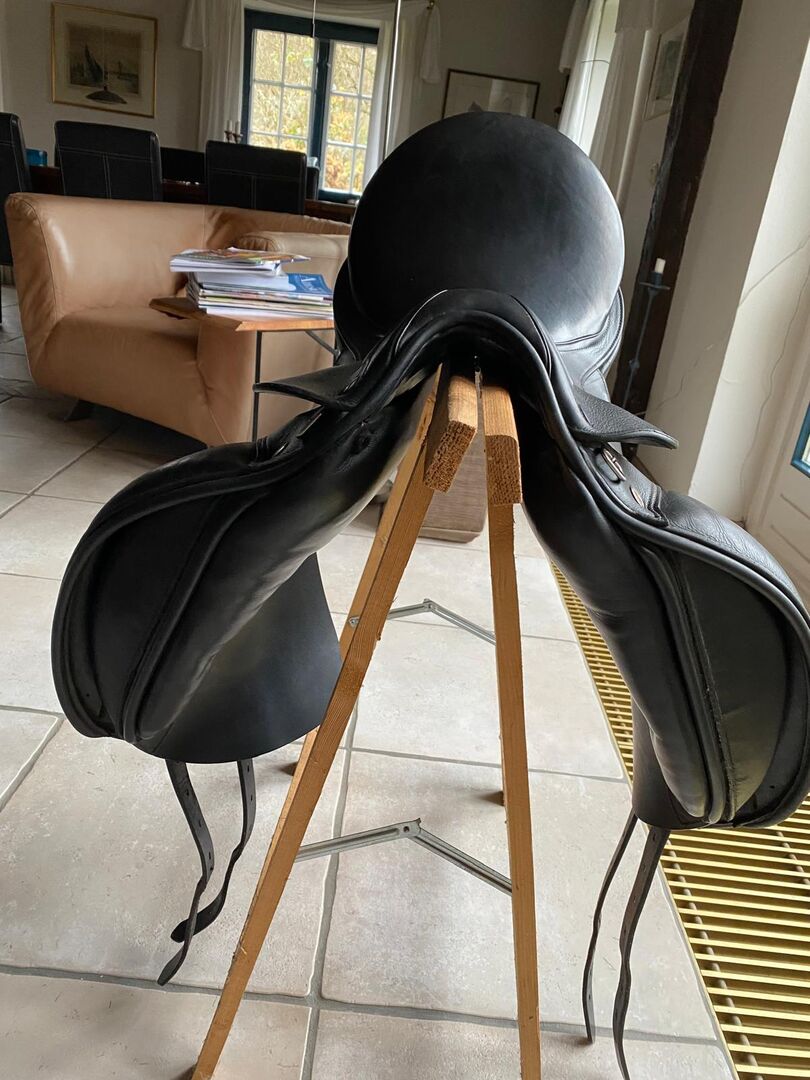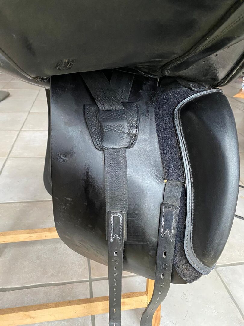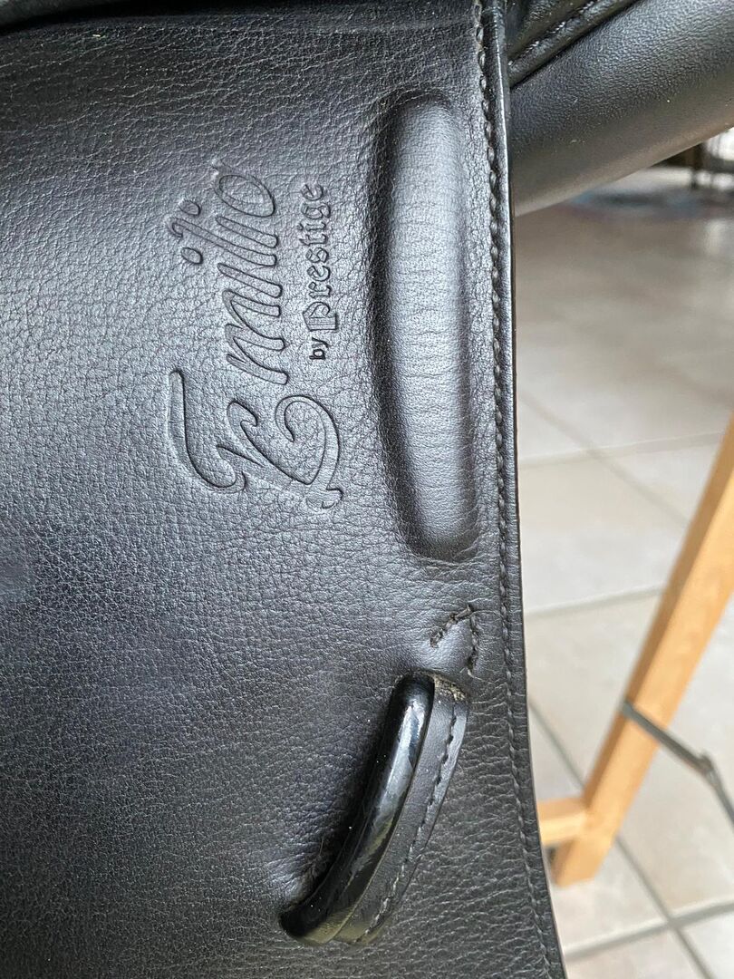 Siodło ujeżdżeniowe, Emilo D by Prestige for Euroriding, czarne 33/17 - Bardzo wygodne siodło ujeżdżeniowe (podwójne klapy siodła) w doskonałym stanie, bez wad, ponieważ było mało używane (skoczek pokazowy). Komora 33, rozmiar siedziska 17''