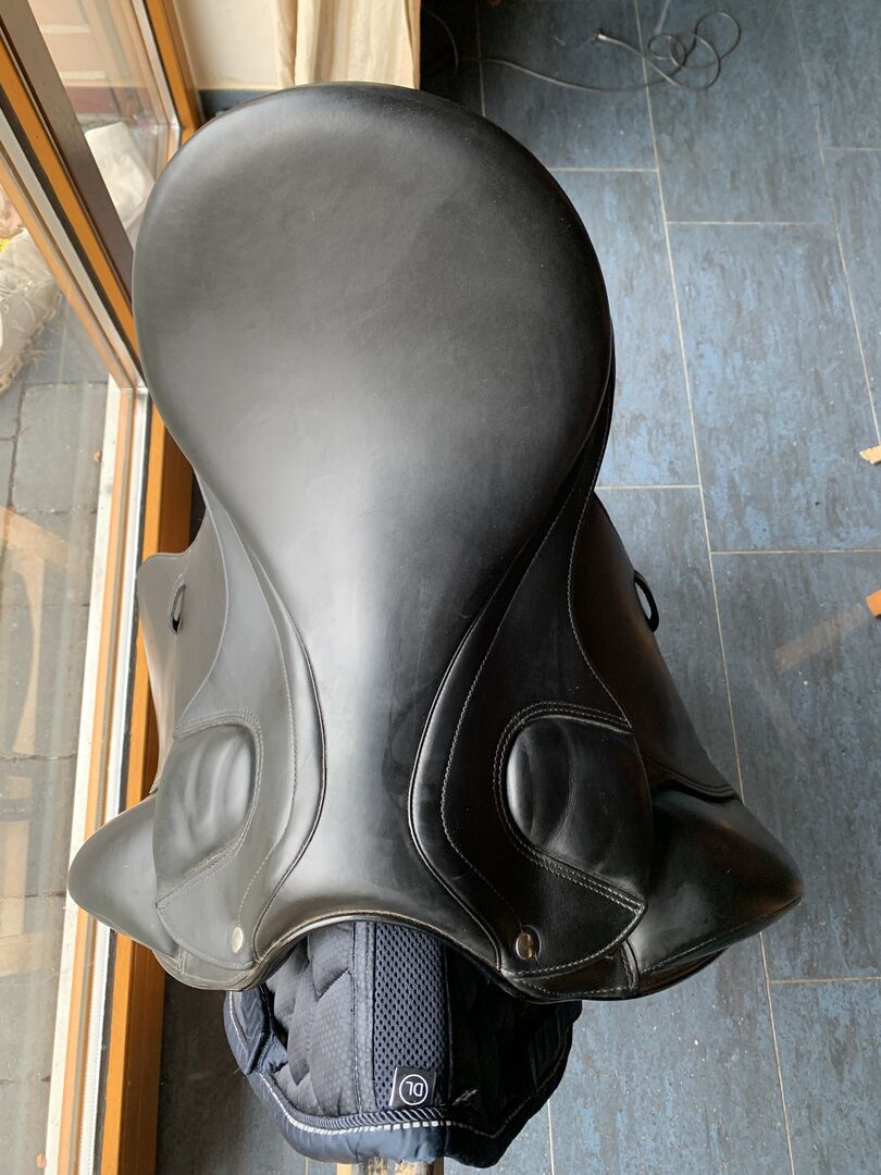 Siodło ujeżdżeniowe Erreplus, jak nowe, zamontowane na klacie - Sprzedaję moje topowe siodło ujeżdżeniowe Erreplus, ponieważ mój koń niestety nie nadaje się już do jazdy. Siodło ma 17 cali i średnią komorę (było wcześniej na koniu z dużym kłębie, ale też na takim z mniejszym). Siodło posiada poduszki przy zawieszeniu strzemion, które można dowolnie napełniać lub opróżniać, dzięki czemu siodło nigdy nie uciska w tym miejscu. Siodło kupiłam w 2018 roku, ale niestety koń przez większość czasu był kulawy, więc przez większość czasu wisiało w naszej ogrzewanej piwnicy. W razie jakichkolwiek pytań proszę pisać