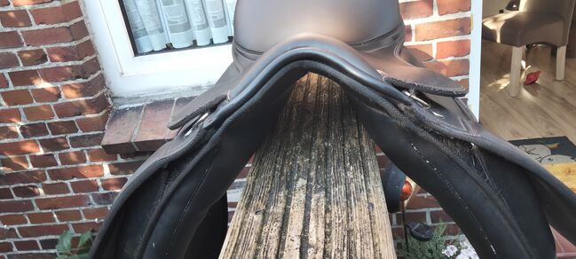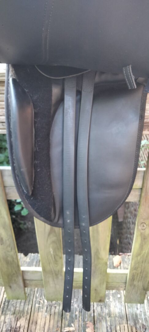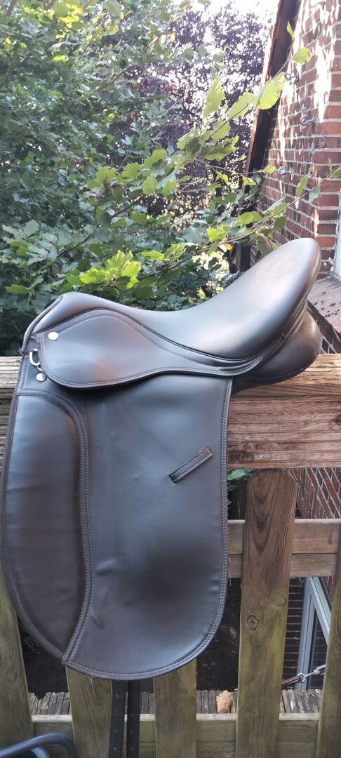 Siodło ujeżdżeniowe Harrys Horse 16,5 - Sprzedaję 16,5-calowe siodło ujeżdżeniowe od Harrys Horse z wymienną płytą wpustową, ale biała płyta wpustowa wintec jest zamontowana od lat i osobiście nie mogę dopasować innej płyty wpustowej, ponieważ siodło tak bardzo się osiadło. Byłoby to więc coś dla nieco szerszych koni/kucy lub trzeba by je zwężać kawałek po kawałku.
