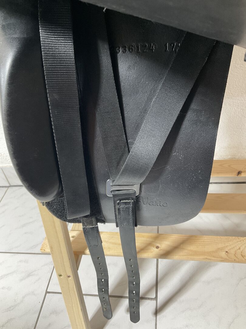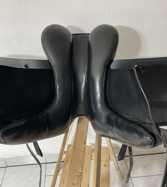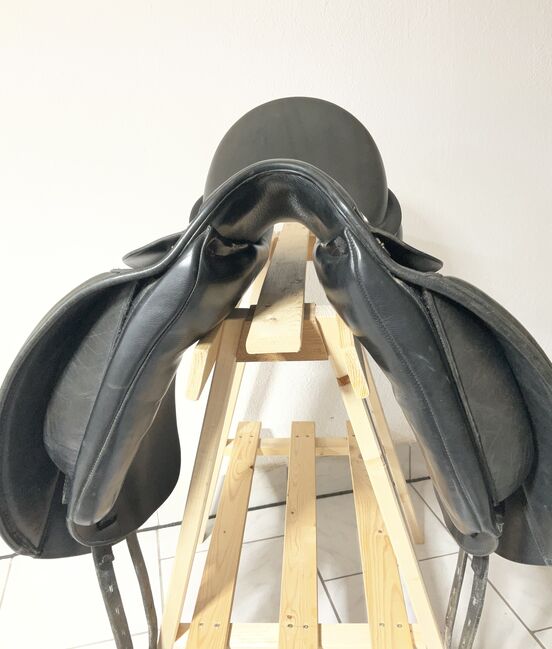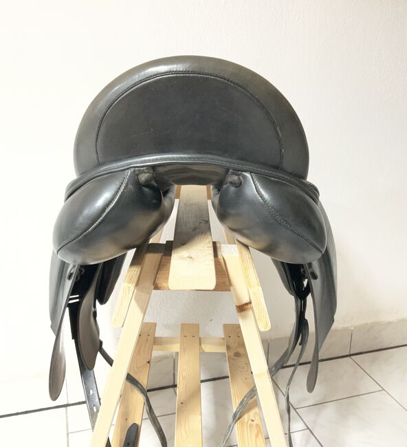 czarna skóra rozmiar siedziska 17,5, głębokie system paneli na rzepy V-girthing KW 31 regulowany na zimno szeroka komora Dla koni z wysokim i średnim kłębiem sięgającym daleko do grzbietu, krótką pozycją siodła i prostą lub lekko wznoszącą się linią grzbietu.