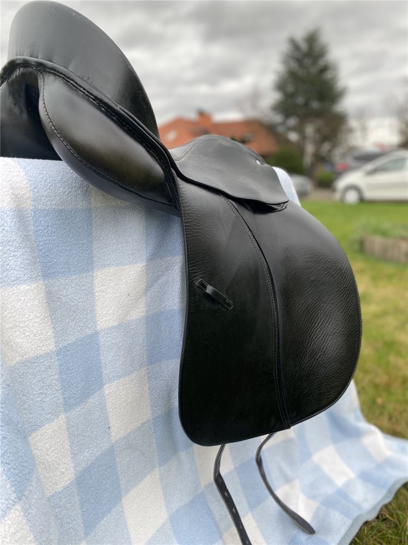 Siodło ujeżdżeniowe Höpfner Dressage F 17 cali - Sprzedam moje ukochane siodło ujeżdżeniowe firmy Höpfner model Dressage F w rozmiarze 17 cali. Jest to dobrze utrzymane siodło z niewielkimi śladami użytkowania! Siodło zostało wyprodukowane w 2005 roku. Siodło było regularnie regenerowane przez rymarza, a wiosną paski do popręgu zostały profesjonalnie odnowione.