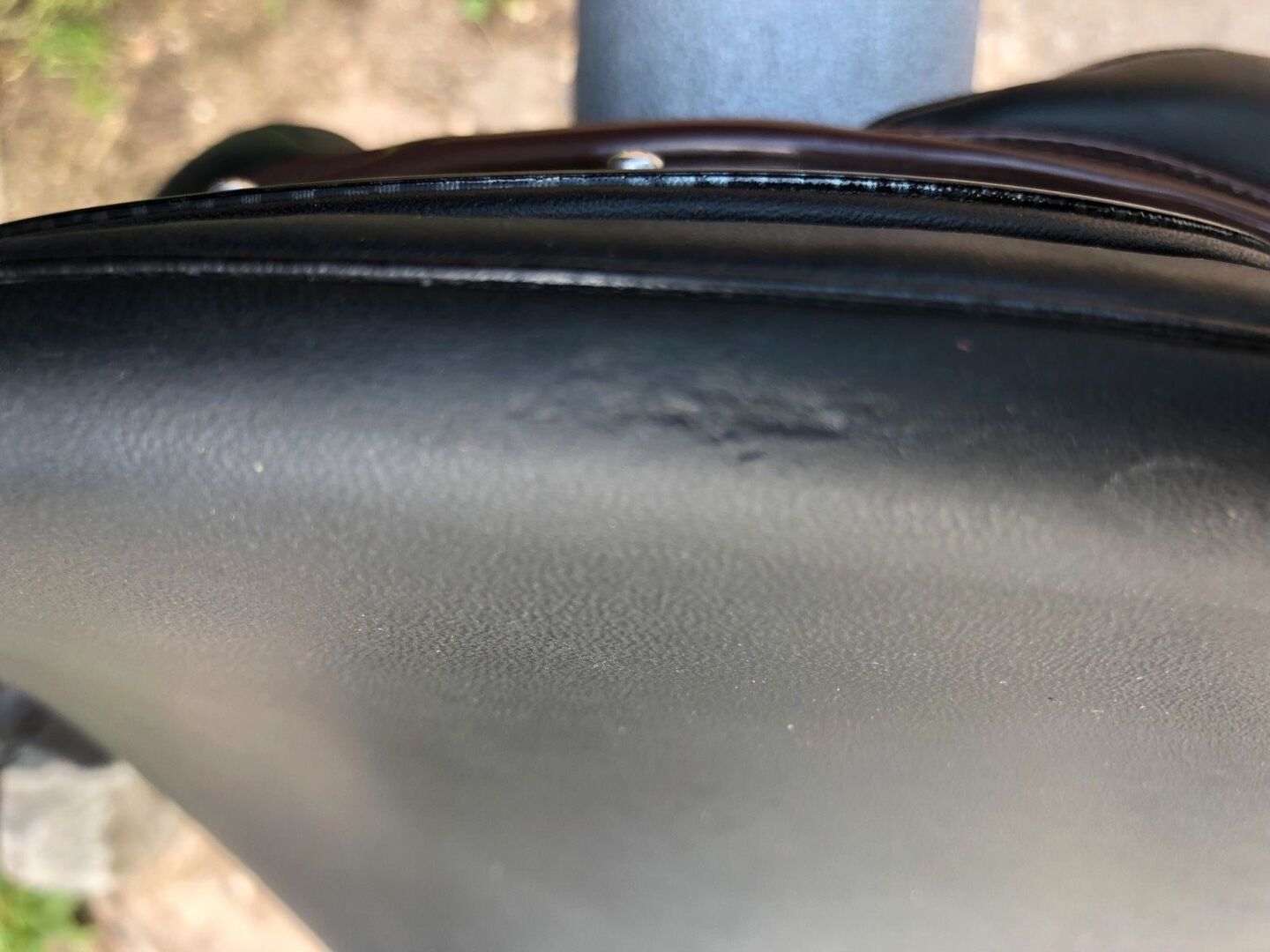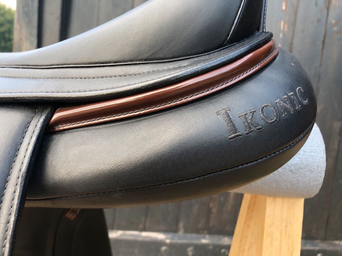 Siodło ujeżdżeniowe Ikonic Pro Evolution 17" (EVOD02) - Oferuję moje siodło ujeżdżeniowe Ikonic Pro Evolution mono flap (EVOD02) w kolorze czarnym z brązowymi detalami. Zostało zakupione w październiku 2021 roku, ale było używane do połowy 2023 roku. Niestety muszę je oddać, ponieważ mój koń nie nadaje się już do jazdy. Siodło jest bardzo wygodne i oferuje luksus dla jeźdźca i konia. Widać na nim naturalne ślady użytkowania, na przykład na strzemionach, ale zawsze było zadbane, dlatego nadal jest w dobrym stanie. Siodło ma również niewielką skazę (ok. 2 cm) na klapie siodła, która jest ledwo widoczna (patrz zdjęcie). Siodło jest oferowane wraz z klapami siodła i inną płytą wpustową (W), płyta wpustowa MW jest obecnie zamontowana.