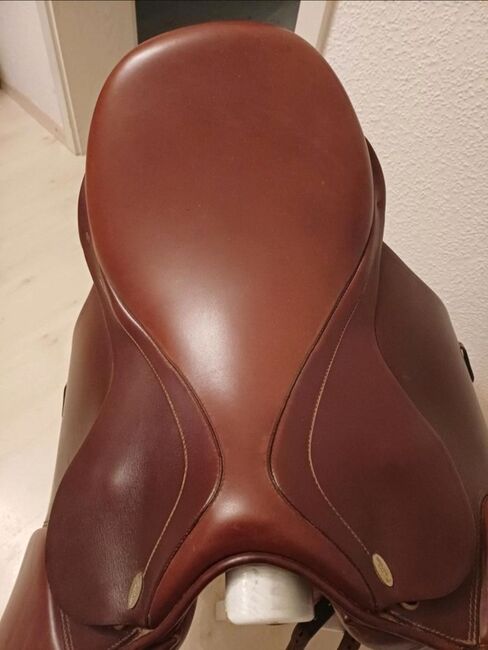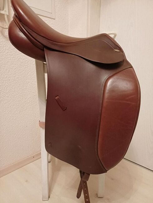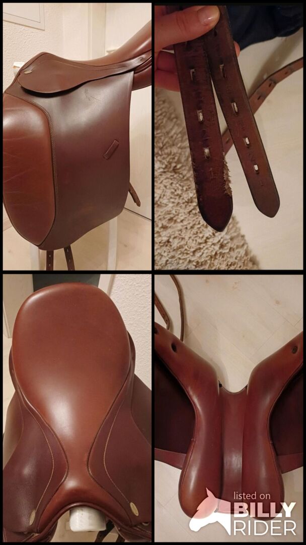 Siodło ujeżdżeniowe Kentaur Iceland 2 - Na sprzedaż super eleganckie i wygodne siodło ujeżdżeniowe firmy Kentaur. Model Iceland 2, specjalnie dla szerokich krótkich grzbietów koni. 17,5" w kolorze Tobacco. Świeżo wyściełane przez rymarza latem 2025 roku i ogólnie w bardzo dobrym stanie, z wyjątkiem lekko postrzępionego paska do popręgu (patrz ostatnie zdjęcie). Płaskie siedzisko z dłuższą klapą siodła i szerokością komory 5 (regulowaną). Pomiary na życzenie. Możliwa wysyłka