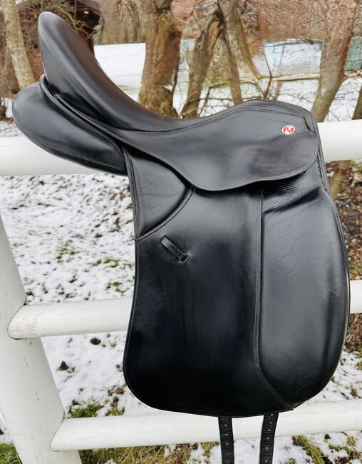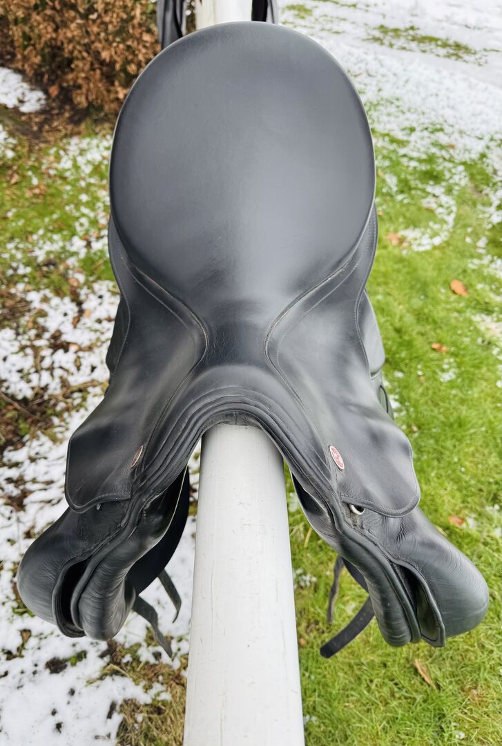 Siodło jest w dobrym, używanym stanie i było regularnie konserwowane. Oferuje niezbędny komfort i odpowiednie wsparcie podczas pracy ujeżdżeniowej.