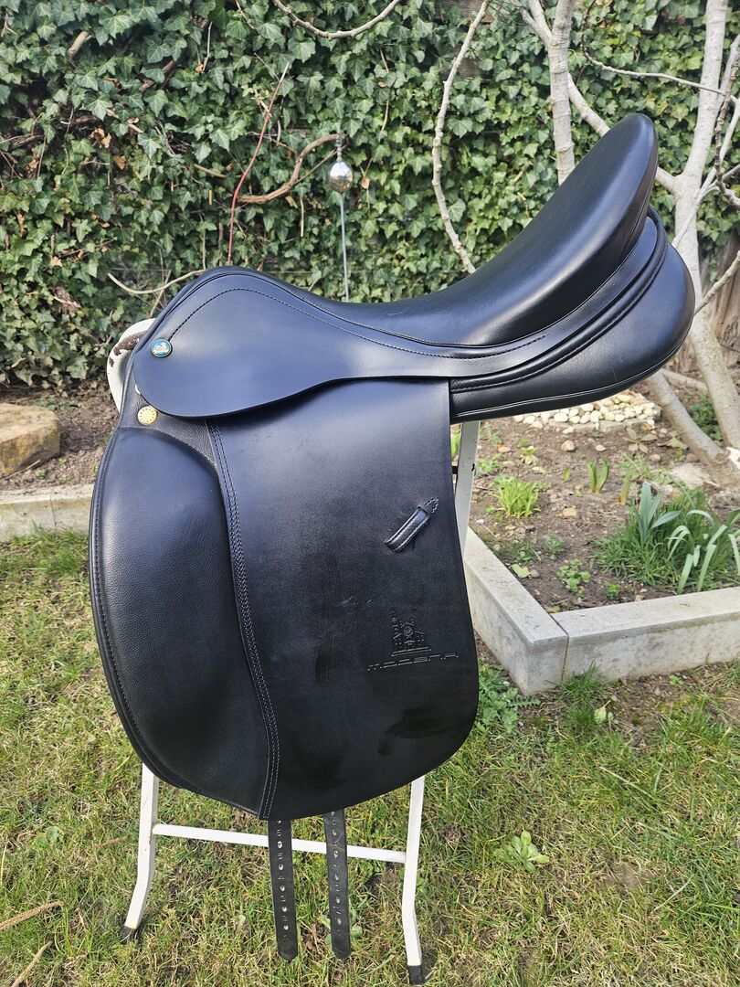 Siodło ujeżdżeniowe Modena by Prestige (32 KW, 18'') - Kupiłem siodełko w październiku 2025 roku i użyłem go tylko 5 razy. Nowa cena wynosiła 2390 €, faktura jest dostępna. Pokrowiec na siodło również.