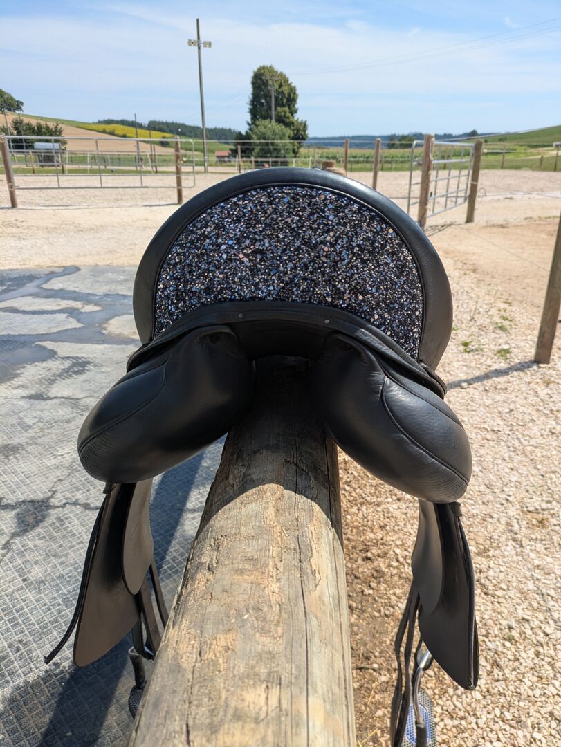 To siodło jest wyposażone w elastyczne drzewo siodła "Flexus". Dostępne są również pasujące rolki kolanowe. Tylny łęk jest ozdobiony niebieskim brokatem, jak widać na zdjęciu 3. Książka siodła jest dostępna.
