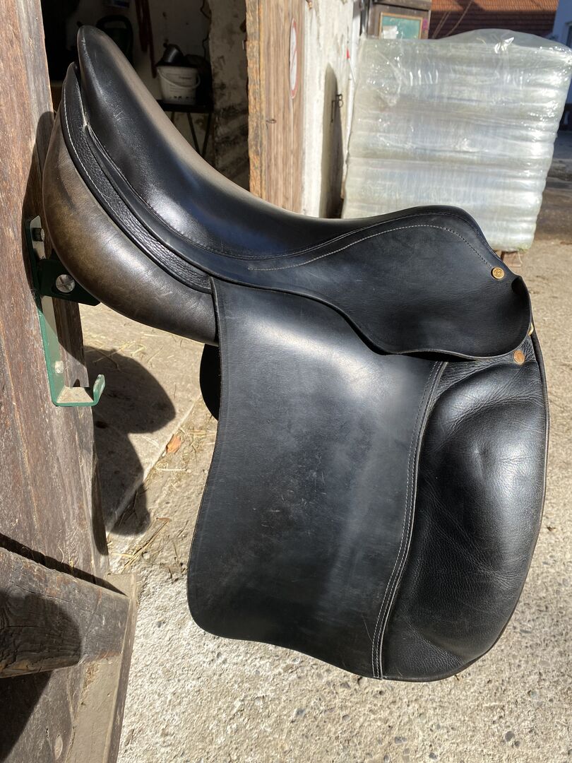 Siodło ujeżdżeniowe P.A. Spirig Gossau 17 cali - To używane siodło ujeżdżeniowe od P.A. Spirig Gossau jest idealne dla wymagających jeźdźców. Wykonane w Szwajcarii z wysokiej jakości skóry w ponadczasowej czerni, przyciąga wzrok. Siodło jest dostępne w rozmiarze 17 cali i dlatego jest odpowiednie dla większości jeźdźców.