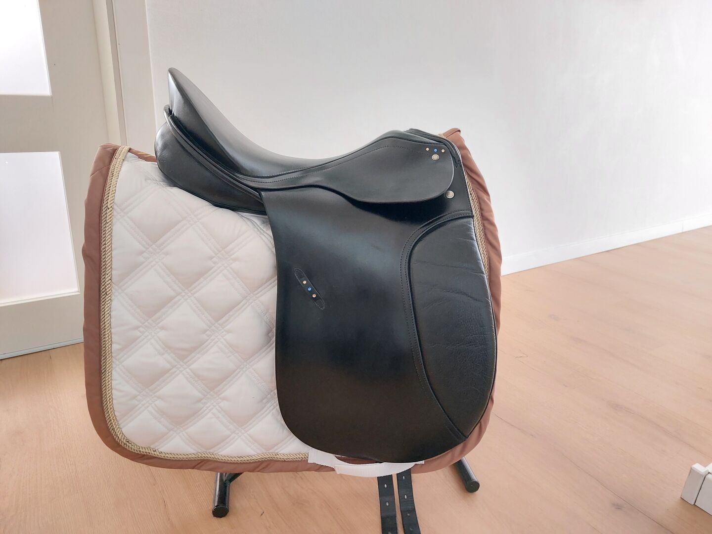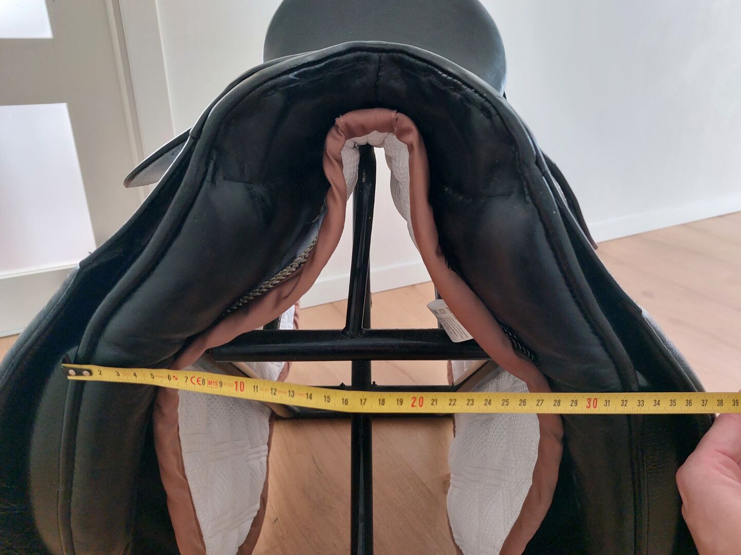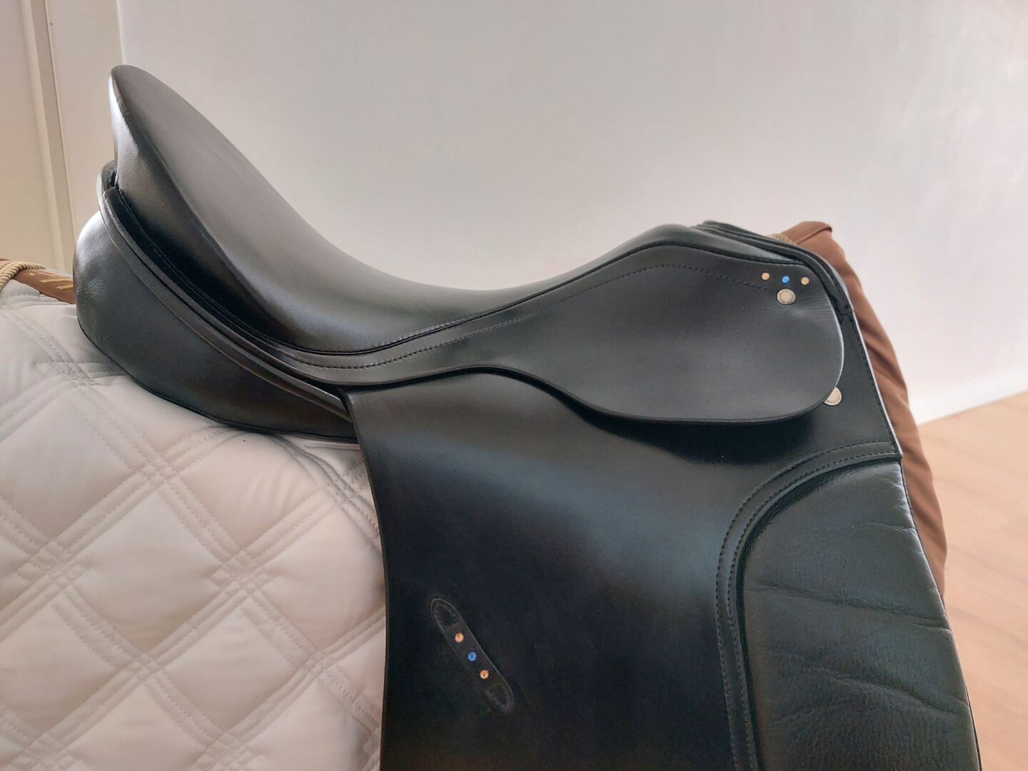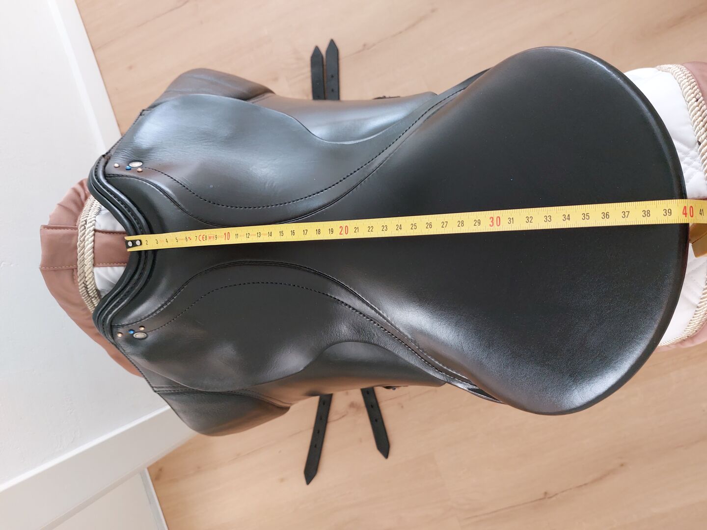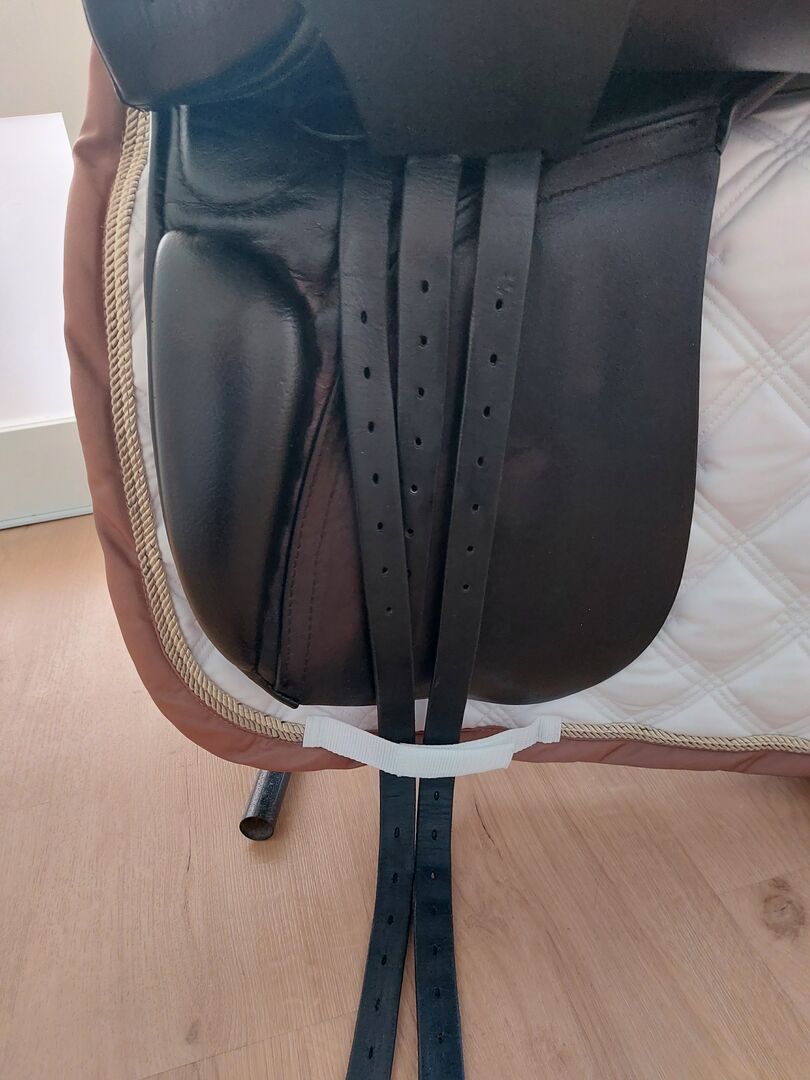 Siodło ujeżdżeniowe Passier Lenox 17 cali Swarovski Strass dobrze utrzymane! - Na sprzedaż świetnie utrzymany Passier Lenox. Rozmiar siedziska 17 cali, wymiary ustawiłem na zdjęciach. Bardzo wygodny, rzadko używany. Posiada trzy paski do zmiennego opasania. Może być używany z długim lub krótkim obwodem. Przód jest ścięty do tyłu, aby pomieścić konia z większym kłębiem. Panele siodła dobrze rozkładają ciężar jeźdźca na grzbiecie konia. Widoczne ślady użytkowania, ale NIE pęknięcia siodła, brak fal w siedzisku, otwarte szwy itp.