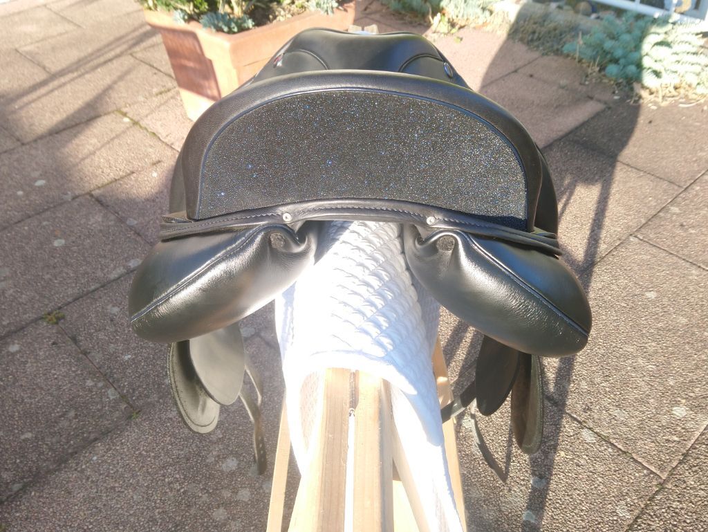 Wyposażony jest w 18-calowe siedzisko, wgłębienia na wypustki, panele 3/4 (bardzo duża powierzchnia styku, a tym samym optymalne rozłożenie ciężaru), pętle strzemion z ozdobnej skóry na klapie siodła, granatowe przeszycia/detale oraz lamówkę z niebieskiej, czarnej błyszczącej skóry ozdobnej.