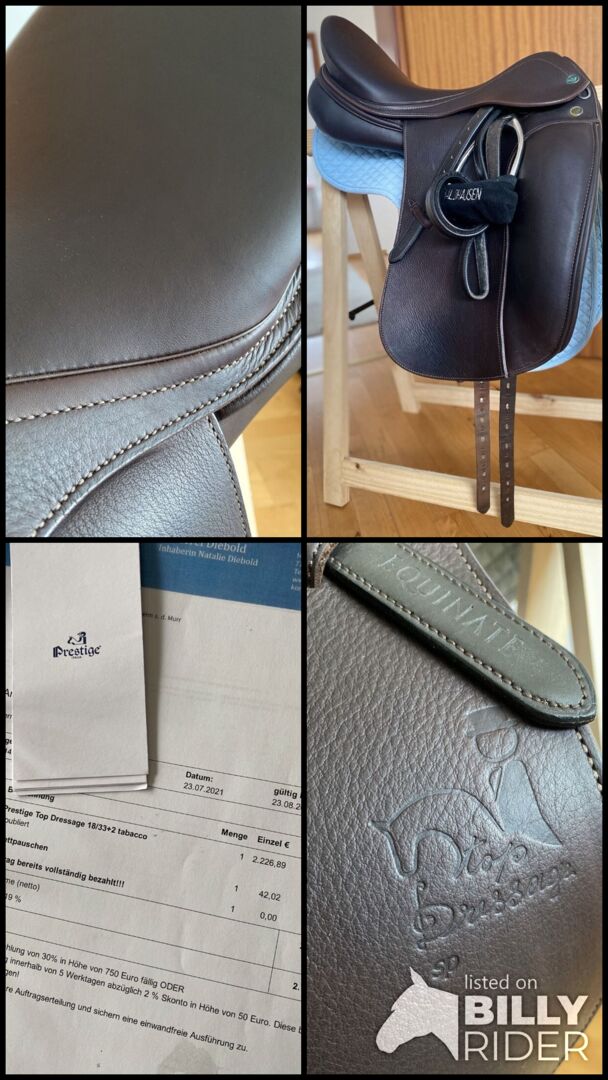 Siodło ujeżdżeniowe Prestige brązowe - Sprzedam nowe siodło ujeżdżeniowe Prestige "Top Dressage" 18/33+2, podwójne, w kolorze tabacco. Z panelami na rzepy.