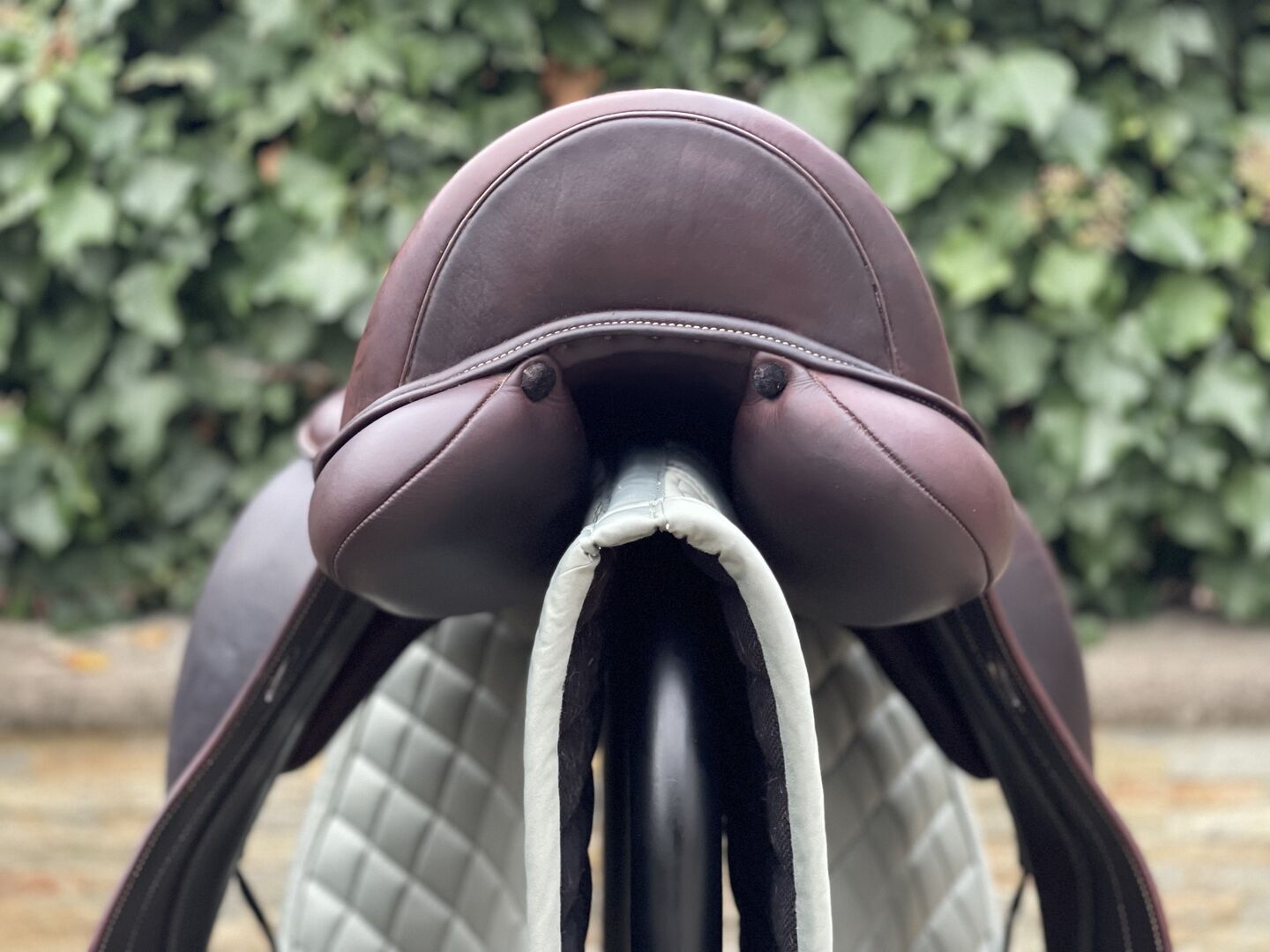Model: Leopold Siedzisko: podane jako 18,5 cala, ale okazuje się, że jest to 18 cali. Rok produkcji: 2021 Klapa siodła: normalna, mono klapa z miękkiej skóry okładkowej Szerokość otworu: może być regulowana przez system UGS (patrz zdjęcie) Wypełnienie: wełna, zostało niedawno całkowicie odnowione Kolor: brązowy Dopasowanie: dla prostych do lekko wygiętych grzbietów o średnio wysokim kłębie. Stan: skóra w miękkiej oprawie jest bardzo wrażliwa, dlatego w obszarze skór strzemion są ślady zużycia, poza tym jest w doskonałym stanie i bardzo zadbana. Skóra: miękka oprawa Pommele: duże Siedzenie: głębokie Obwód: długie paski obwodu
