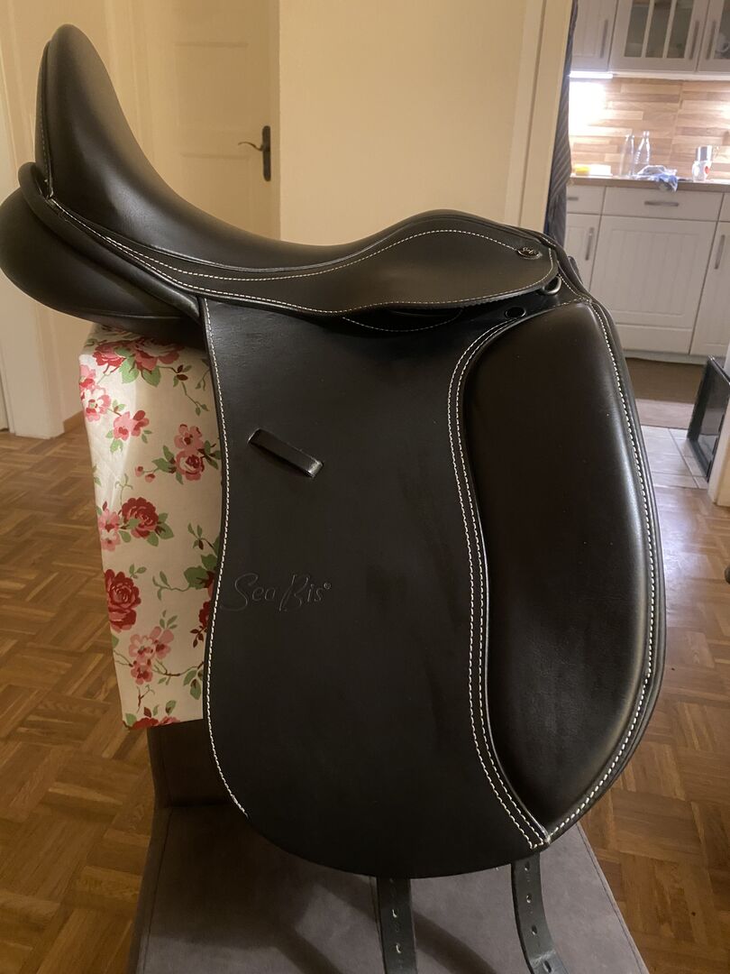 Siodło ujeżdżeniowe SeaBis Carina Pro - Sprzedam siodło ujeżdżeniowe SeaBis Carina Pro w bardzo dobrym stanie, 17,5" w kolorze czarnym. Optycznie prawie jak nowe. Ma teraz 3 lata, nie było w ogóle używane w pierwszym roku i nie tak często w ciągu ostatnich dwóch lat z powodu kontuzji. Obecnie zamontowany jest zielony gullet. Płytę wpustową można łatwo wymienić, dzięki czemu siodło można bardzo łatwo dostosować. Krótki popręg w 3D AirMash, lekkie plastikowe strzemiona i skóry strzemion dostępne na życzenie. NP 2.250,00 € Dostępna faktura