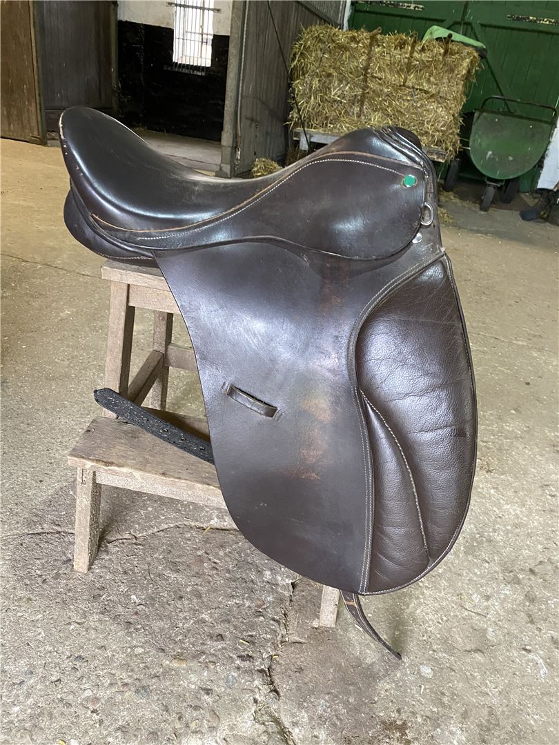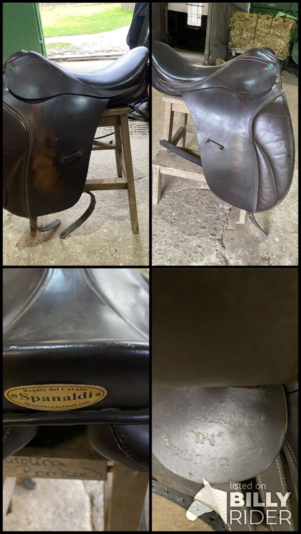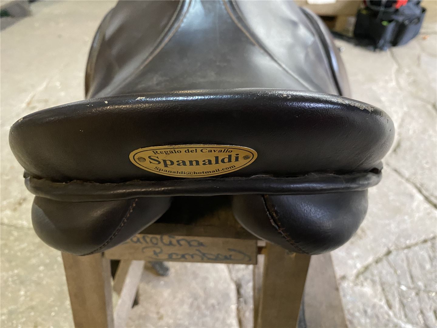 Siodło ujeżdżeniowe Spanaldi 17,5'' - Witam, sprzedaję siodło ujeżdżeniowe Spanaldi w kolorze brązowym, ponieważ nie pasuje ono na moją klacz. Ma 17,5 cala, długość klapy siodła wynosi 45 cm. Siodło jest sprawne, skóra na brzegu siodła jest trochę wytarta, co było spowodowane przez poprzedniego właściciela. Cena dotyczy sprzedaży, możliwa jest wysyłka.