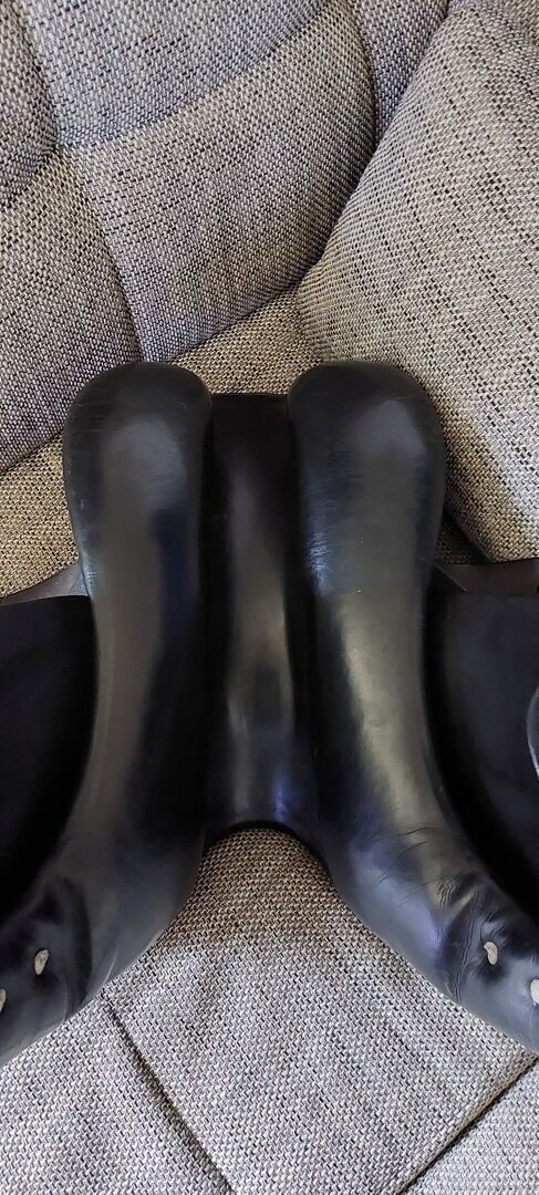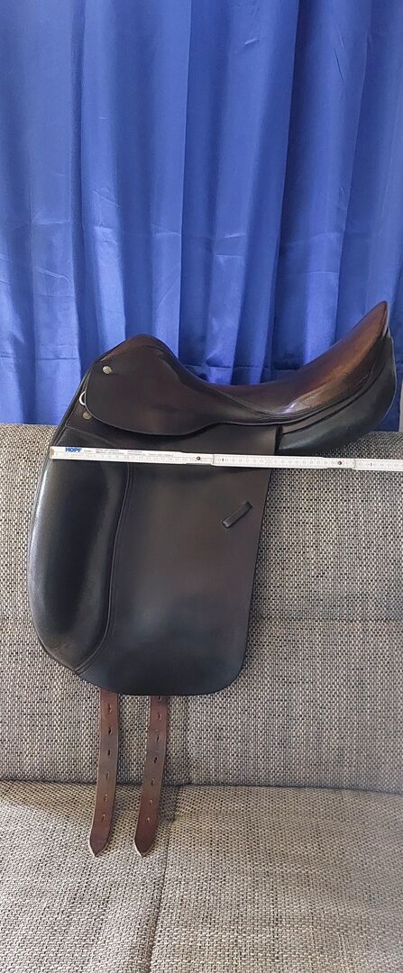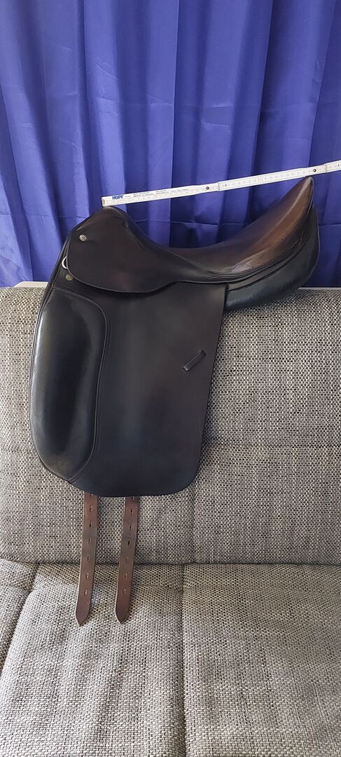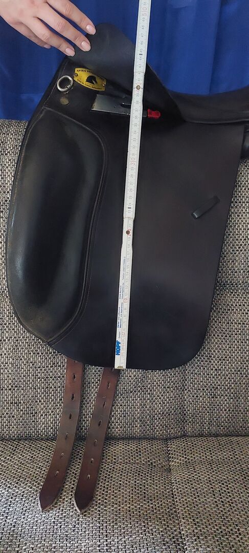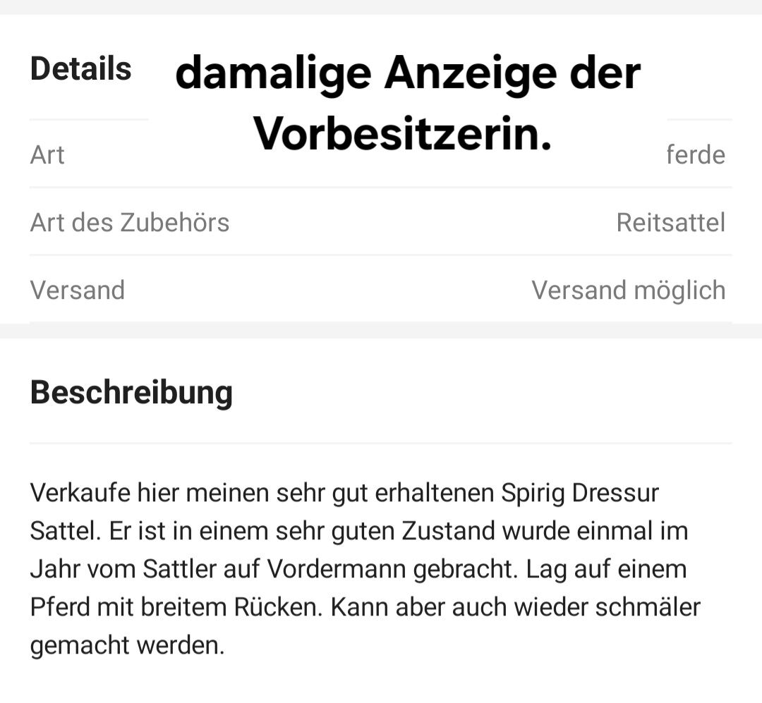 Siodło ujeżdżeniowe Spirig St.Gallen - Na sprzedaż ciemnobrązowe siodło ujeżdżeniowe marki Spirig. Normalne ślady użytkowania. Siodło było kupione z drugiej ręki, dlatego podane są wymiary. Opis poprzedniego właściciela zdjęcie 9. Sam miałem je raz u rymarza bez zmian, nieużywane. Przechowywane na sucho w domu. Dla koni o szerokich, krótkich grzbietach.