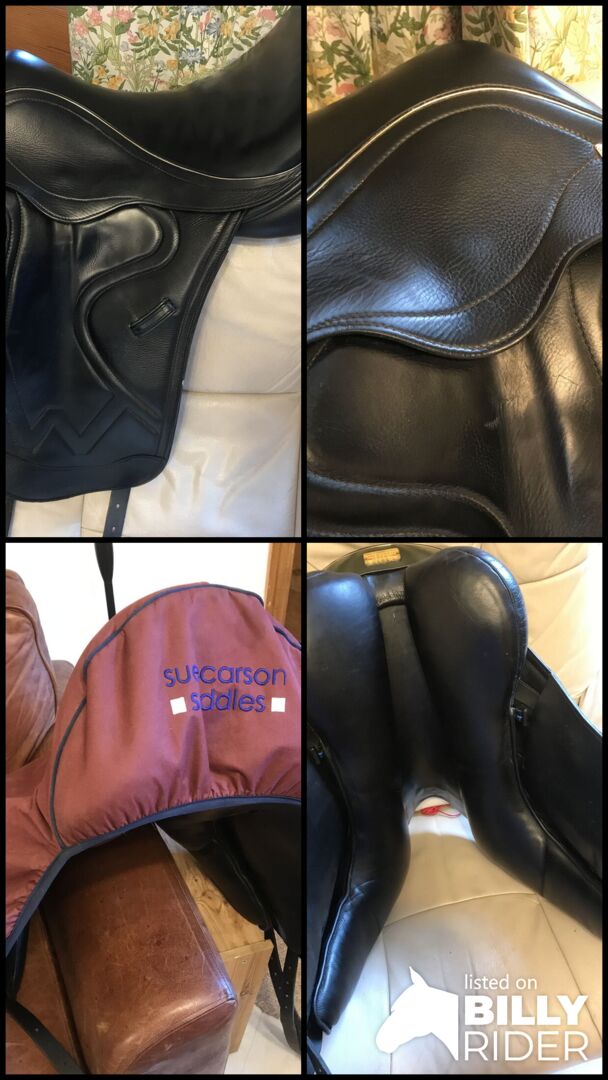 “Sue Carson” mono flap dressage saddle. Black. Air/flair system can be infinitely adjusted by Sue Carson fitter. Two girth straps. Beautiful saddle, very well cared for. 17.5 inch saddle, deep seat & great knee block.