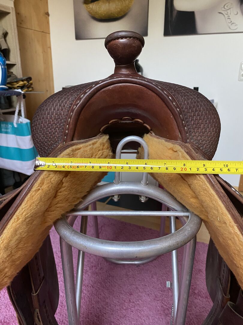Siodło ujeżdżeniowe Superior Gomeier/wykonane na zamówienie - Piękne westernowe siodło od Gomeier Ekstra wykonane Superior. Skóra jest szorstka, dzięki czemu ma świetne dopasowanie. Siedzisko ma 15 cali. Pozostałe wymiary są pokazane na zdjęciach. Miałem to siodło na moim Quarterze, który niestety zmarł w zeszłym roku. Był raczej drobnej budowy. Nowa cena wynosiła 6200 €.
