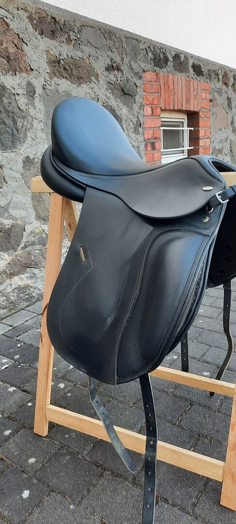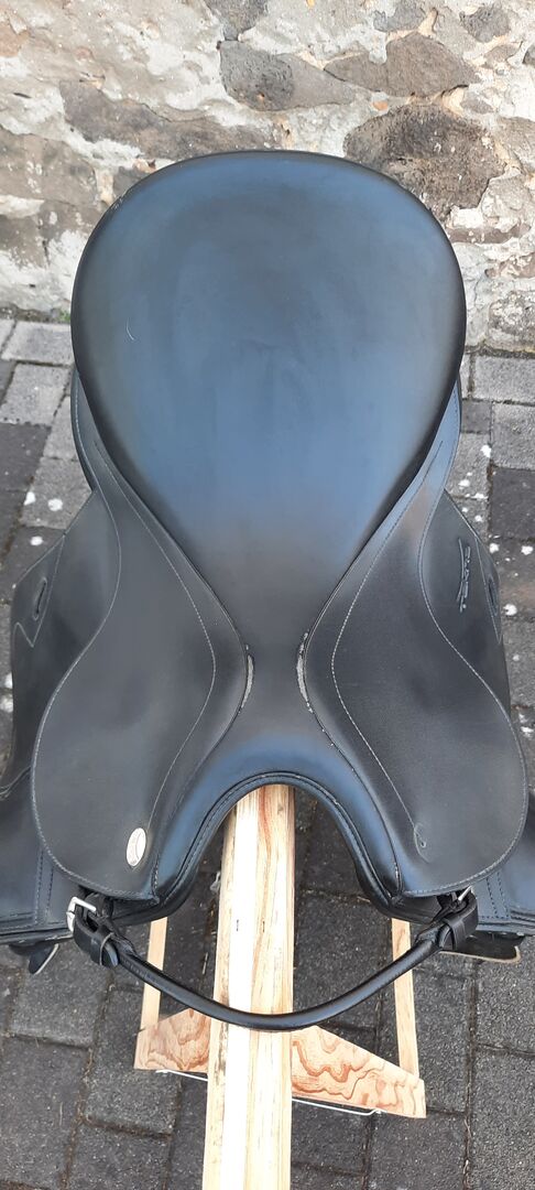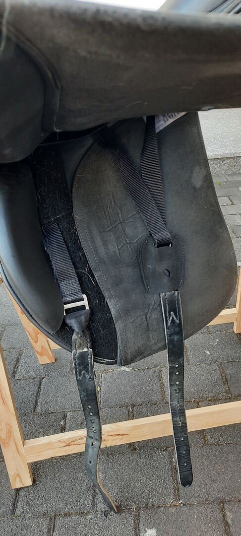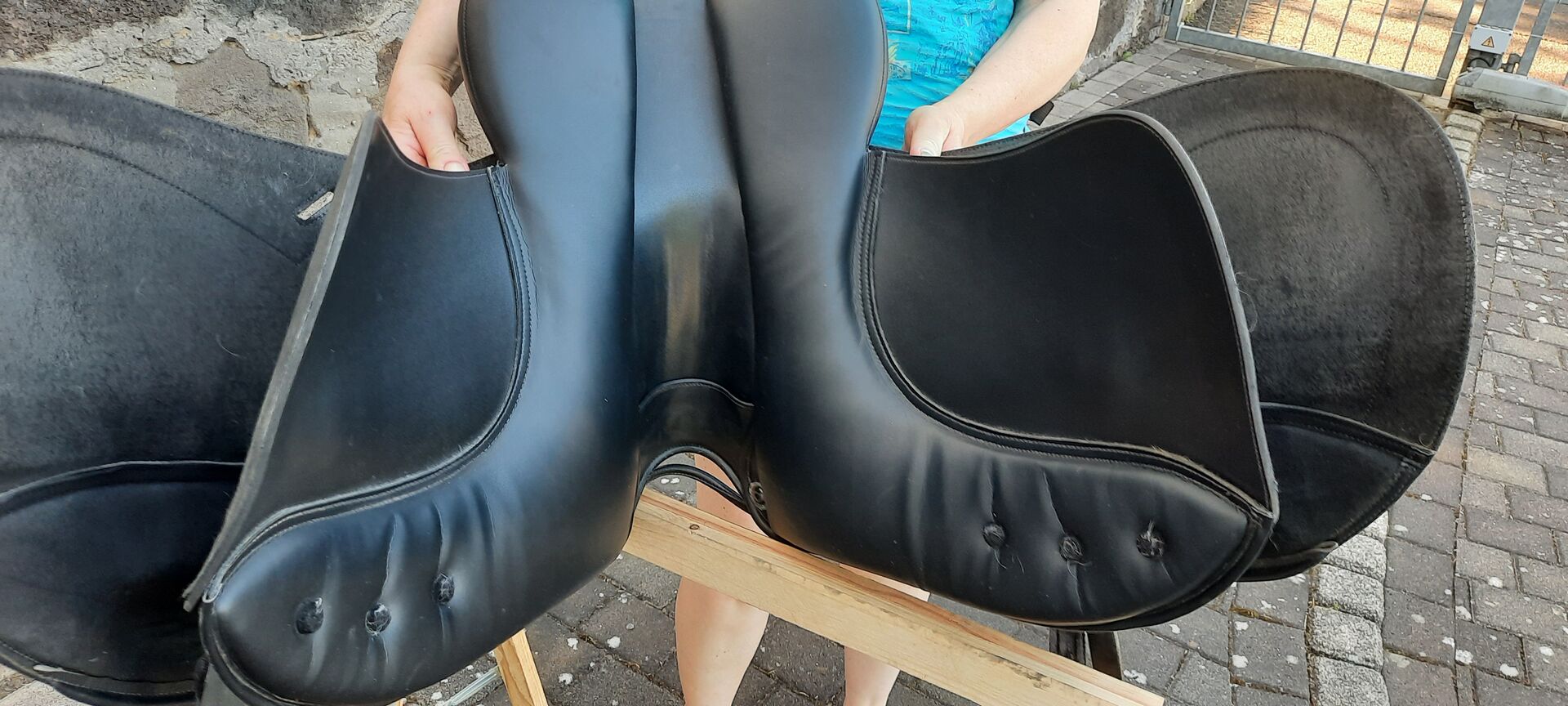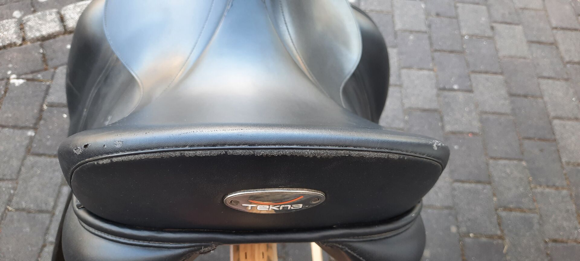Siodło ujeżdżeniowe Tekkna - Z ciężkim sercem sprzedaję moje bardzo wygodne 17,5-calowe siodło ujeżdżeniowe Tekkna, ponieważ nie pasuje ono do mojego konia, a ja przerzuciłam się na zawody. Skóry strzemion są sprzedawane razem z siodłem. Płyta wpustowa może być łatwo wymieniana przez jeźdźca. Obecnie montowana jest czerwona płyta wpustowa o średniej szerokości wpustu. Niestety, siodło ma kilka wad, które są ledwo zauważalne, gdy siedzi się na koniu (patrz zdjęcia). Osobiście nie przepadam za siodłami ujeżdżeniowymi, ale od razu stwierdziłem, że jest bardzo wygodne, nawet jeźdźcy westernowi uznali je za komfortowe.