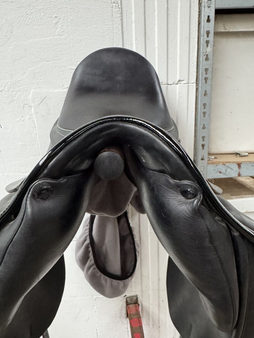 Siodło ujeżdżeniowe Velicea Onyx - Sprzedaję moje siodło ujeżdżeniowe Velicea Saddlery model Onyx. Jest czarne z szarymi przeszyciami i czarnym lakierem. Rozmiar siedziska 17 cali. W listopadzie 24 klapa siodła została zwężona i odnowiona, stąd szwy po obu stronach. Siodło zostało również ponownie tapicerowane w tym samym czasie. Zawsze było zadbane i wygląda jak nowe!