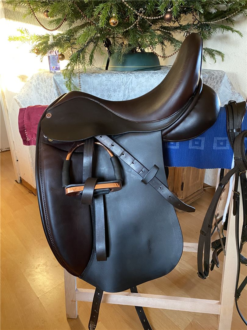 Siodło ujeżdżeniowe w dobrym stanie - Cena jest VB! Wystarczy podać propozycję ceny. Oferuję tutaj moje około 4-letnie siodło. Rozmiar siedziska: 17 1/2. (Bardzo dobrze sprawdził się na moim Haflingerze, ale nadaje się również dla innych koni). Miałem go przez 1,5 roku, ponieważ kupiłem go od znajomego. Niestety nie mogłam go używać zbyt często, ponieważ mój koń miał poważną artrozę. (może 10 razy) W związku z tym, że mój koń musiał zostać uśpiony w lipcu, sprzedaję go. Prawdopodobnie niewiele osób zna tę markę, niestety nie jest już dostępna. Oczywiście widać na nim ślady użytkowania, ale nie jest nowy. Pierwotna cena wynosiła 3400 EUR. (Niestety, nie ma już na to faktury). Sprzedałbym go z pasem (krótki pas-> 55cm). Różne derki pod siodło (widoczne na zdjęciach, jeszcze nie wyprane) Strzemiona, skóry na strzemiona. Podobnie jak pokrowiec na siodełko tej samej marki.