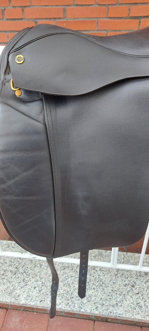 Siodło ujeżdżeniowe Walsall Riding 17,5", czarne, średnio głębokie siedzisko - Oferuję klasyczne siodło ujeżdżeniowe Walsall w dobrym stanie. Siodło nosi normalne ślady użytkowania i zawsze było zadbane. Jeden pasek został odnowiony w 2021 r., pozostałe paski są w bardzo dobrym stanie. Siodło kupiłam nowe w 2016 roku, niestety nie pasuje już na mojego konia i dlatego chciałabym je sprzedać. Siodło ma szeroki kanał grzbietowy i popręg w kształcie litery V z paskiem do popręgu. Użyto go na większym wałachu o mocnych ramionach i wyraźnym kłębie. Siedzisko pokryte jest skórą cielęcą, w tym miejscu ślady użytkowania są nieco bardziej widoczne (patrz zdjęcia). Szczegóły: - Rozmiar siedziska 17,5". - Drzewo sprężynowe drewniane/stalowe - średnia głębokość siedziska - możliwość zamocowania naparstków na rzepy (naparstki nie są dołączone do zestawu) - armatura mosiężna - Dostawa wraz z oryginalną podkładką pod siodło - Obwód w kształcie litery V z paskiem z przodu.